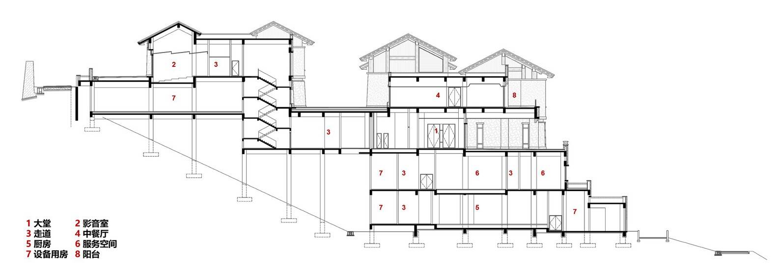 The architectural unit draws inspiration from the traditional form of suspended buildings in Tibetan villages, using suspended floors to set up supporting and equipment rooms. The guest rooms have one floor above ground and one suspended floor. The upper part serves as a residential area, ensuring natural lighting, ventilation, and a scenic experience. The lower suspended floor is used as a supporting or equipment room; The public area consists of two above ground floors and three suspended floors. The upper floor meets the needs of large spaces such as hotel catering and banquets, while the lower suspended floor provides auxiliary functions such as logistics and parking. Using the height difference to set up entrances and exits at different elevations, the tourist entrance is located in the center of the first floor, which is convenient and has a good landscape. The logistics entrance is concealed to achieve separation of flow lines and non-interference with each other. In addition, each guest room base is equipped with an eastward leisure terrace, and the front and rear rows of guest rooms maintain a height difference of about 7 meters, ensuring that each guest room has a good landscape view, overlooking the snow capped mountains and the original ecological ancient Tibetan village.