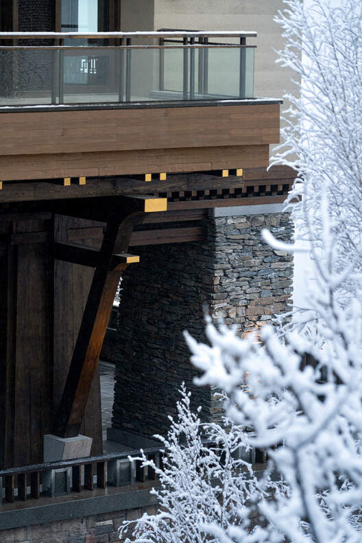 The architectural style draws inspiration from Tibetan and Qiang traditions, using the grandeur of Tibetan watchtowers and the primitive simplicity of Tibetan wooden tatami houses as a blueprint. The facade design incorporates a three part form, continuing the prominent suspended mountain roof, the ancient and wide rammed earth and wooden walls, and the well proportioned base. The architectural design extracts typical features and symbolic language of traditional Tibetan architecture, which are used in the decoration design of wooden components to interpret structural styles such as "Bianma Wall" for walls, "Feizi Wood" for window lintels, and "door bracket" for wooden doors. The height of the building ridge changes and interweaves, and the top lines of the building complex are dynamic and varied. Against the backdrop of towering snow capped mountains, the building and environment blend harmoniously, together outlining a beautiful natural picture. The interior design cleverly integrates Tibetan and Qiang culture, eliminates unnecessary decorations in the interior space, showcases the wooden structural system, and fully displays the beauty of the intersection of beams and columns and the rhythm of the arrangement of first-class rafters. The mirrored layout of the lobby functional area and the axis of guest rooms follow a central sequence. These visual orders all reflect the unique solemnity of Tibetan architecture. The lobby bar replicates the fire pit and chimney, restoring folk scenes; The headboard of the guest room is decorated with auspicious patterns, which are echoed by carpets and lintels. Lucky patterns are used as spatial separation elements in public areas. There are Tibetan objects placed indoors, many of which come from local villagers' homes and have been cleaned or repaired to become the finishing touch in the guest rooms. These symbols that condense regional genes allow Tibetan style to flow naturally from details.