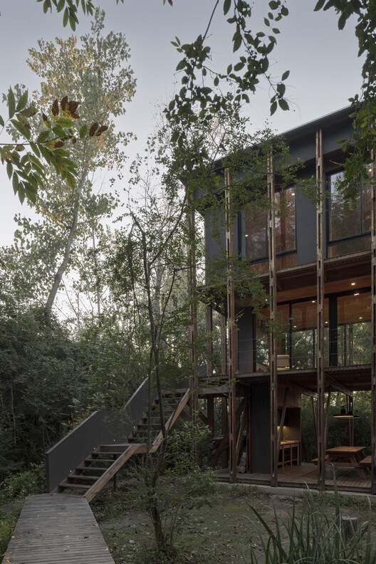 The project chose the high foot pile system - an ancient solution that has been validated by humans in similar environments, which is reinterpreted as a construction manifesto. This matrix composed of industrialized piles is regarded as a unified whole, carrying residential functions and creating a unique architectural system. It is a human expression that integrates artificial elements and transformed natural resources into the vastness of the environment, establishing a profound material connection between architecture and wilderness. The traditional rigid pattern of supporting the upper box with a bottom base has been abandoned, replaced by a structure that rises from the inside of the base, both lightweight and rooted in the earth.