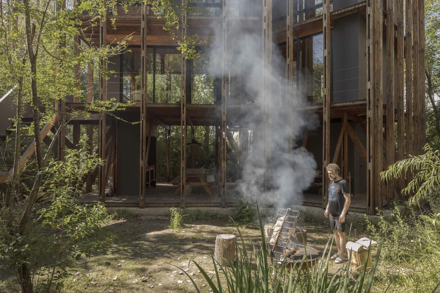 与此同时,项目还进行了一项人性化形式的实验:由两个基本立方体通过一条边相连。这一从高脚桩上拔地而起的“人工森林”,作为形式表达,矗立于自然的狂野与辽阔之前。