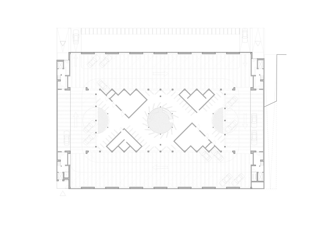 两条绿色轴线的交汇——莱昂·费希特万格街(Lion-Feuchtwanger-Strasse)项目地处两条绿色轴线的交汇处,这两条轴线以南北向和东西向贯穿卡尔斯多夫北(Kaulsdorf Nord)这片大型原民主德国住宅区。两栋六层住宅楼环绕着一个抬升的花园平台,该平台被设计为住宅区的中央公共区域,设有休闲、游乐和聚会空间。平台下方是采光良好的交通层,配备有更多体育设施、自行车和汽车停车位、电动汽车充电站以及居民包裹驿站。项目业主为房地产开发商欧博登(Euroboden)公司。