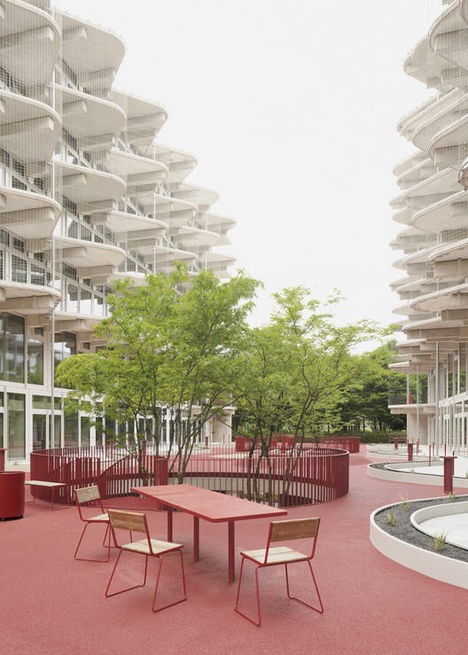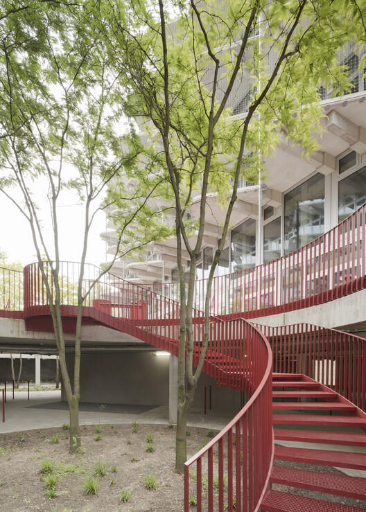 Series construction - The project is surrounded by prefabricated buildings from the 1980s, continuing the story of series construction. It uses a series of prefabricated concrete component skeletons to counteract the wall panels produced in bulk by surrounding prefabricated buildings, which are commonly used in industrial and commercial buildings. Based on this system, the project meets people's increasingly diverse expectations for their lifestyles and work styles. FAR frohn& Rojas Architects has demonstrated the potential of this construction method in the Wohnegal project in Moabit, Berlin.