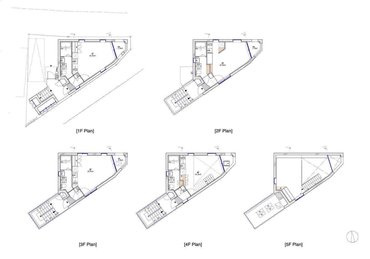Due to the limited space, it is not possible to install an elevator. Therefore, the entrance to the top floor apartment will be located on the fourth floor (the highest point that can be reached by stairs), and the fourth and fifth floors will be connected to create a duplex apartment. The plan and section of the building are both diagonally cut, and although the internal space is small, it has its own sense of depth, creating a unique spatial experience.