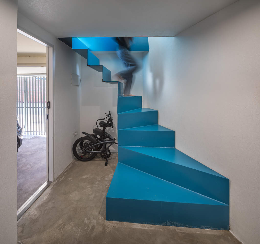 空间流线的巧妙重塑:设计师在此项目中展现了对空间流线的卓越掌控。通过拆除外部楼梯并将首层改造为停车区和主入口,项目重新定义了建筑的内部动线。这种重新规划并非简单的功能叠加,而是围绕着“便捷”和“流畅”展开,巧妙地将停车、入口、厨房和内部楼梯连接起来。新的通行路径设计,使得居民能够自然而然地通往楼上,体现了以人为本的设计理念。此外,二层紧凑而多功能的设计,包括房间、露台和屋顶的布局,在有限空间内创造了丰富的居住体验,满足了现代生活的多样化需求,充分体现了设计师对空间利用的极致追求。