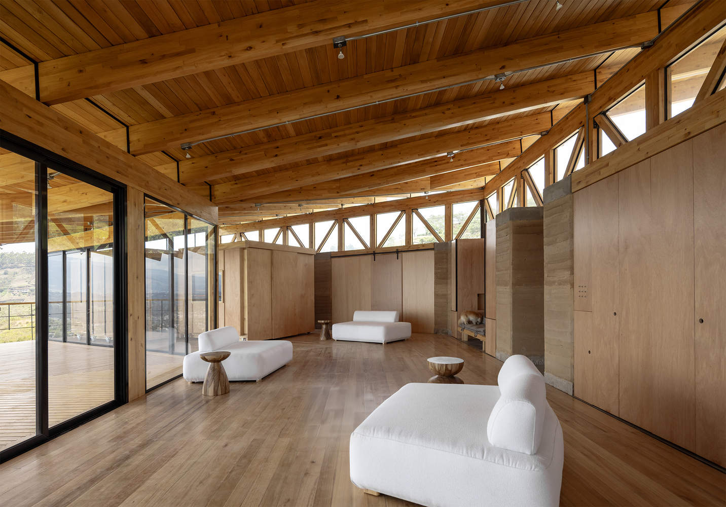 Under a large sloping roof supported by rammed earth walls and laminated timber structures, a continuous and flexible space is formed. This roof not only provides shelter, but also allows for multiple ways of use. There are no fixed partitions in the residence; All layouts revolve around a service wall and a series of movable elements that can change the spatial layout as needed.