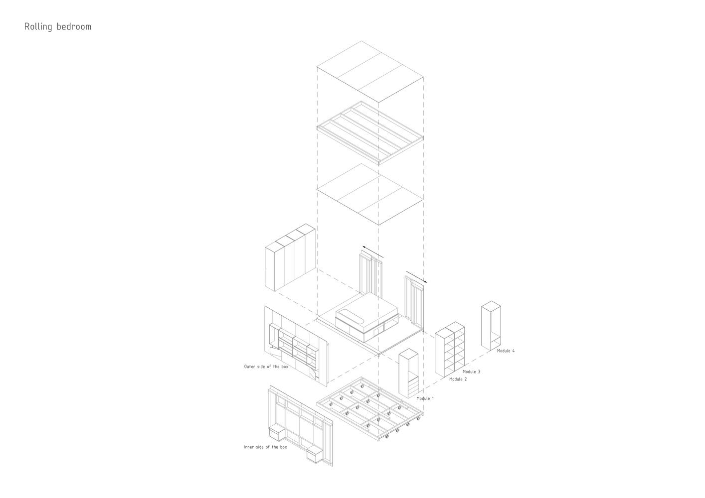 Two large rolling wooden boxes accommodate private space: a master bedroom with a wardrobe and dressing table, and a study with both TV room functionality and a built-in sofa bed. These boxes can be moved within the building volume, allowing for different spatial configurations: open for gatherings, close for privacy, and reorganize according to lighting, climate, or mood.