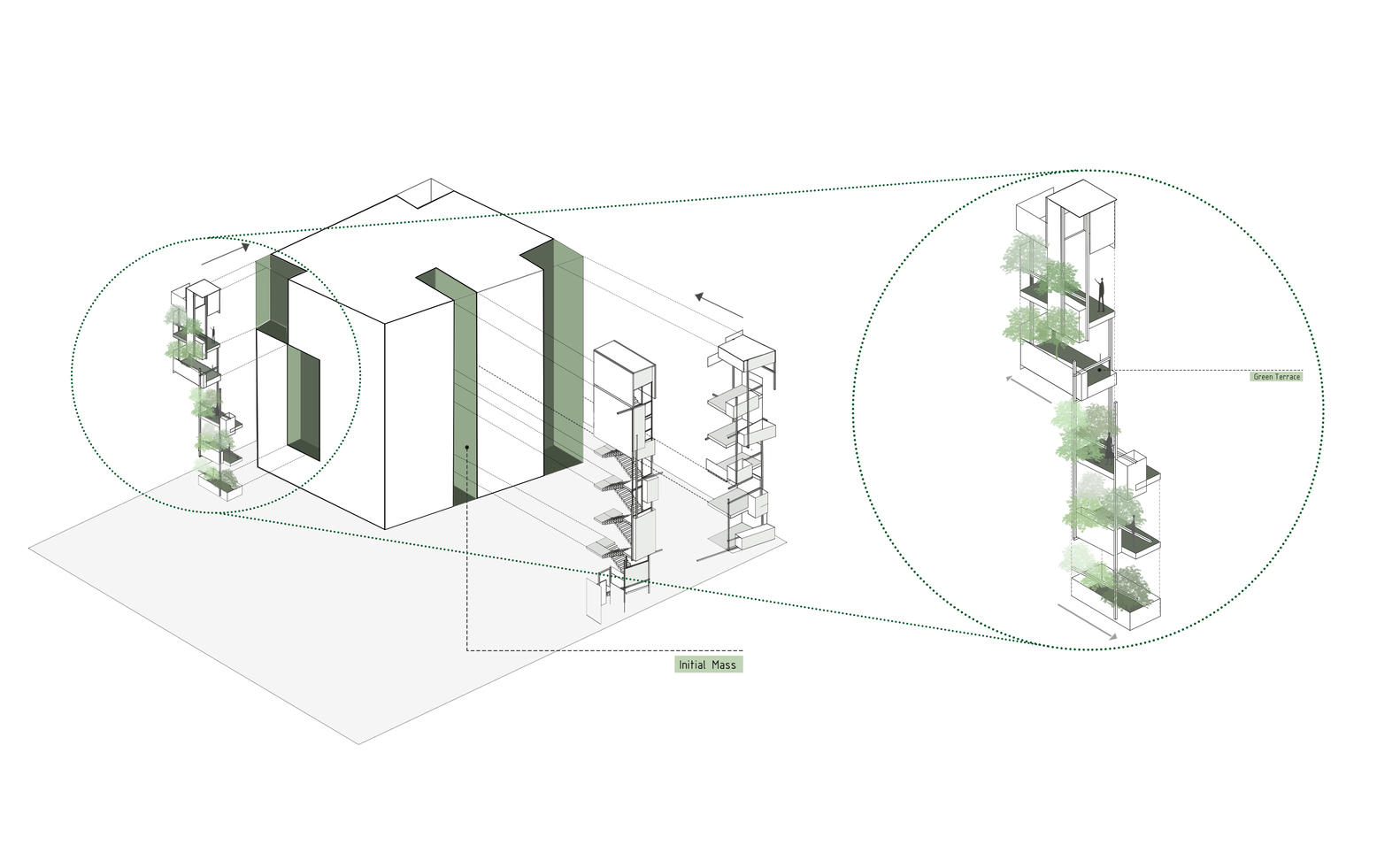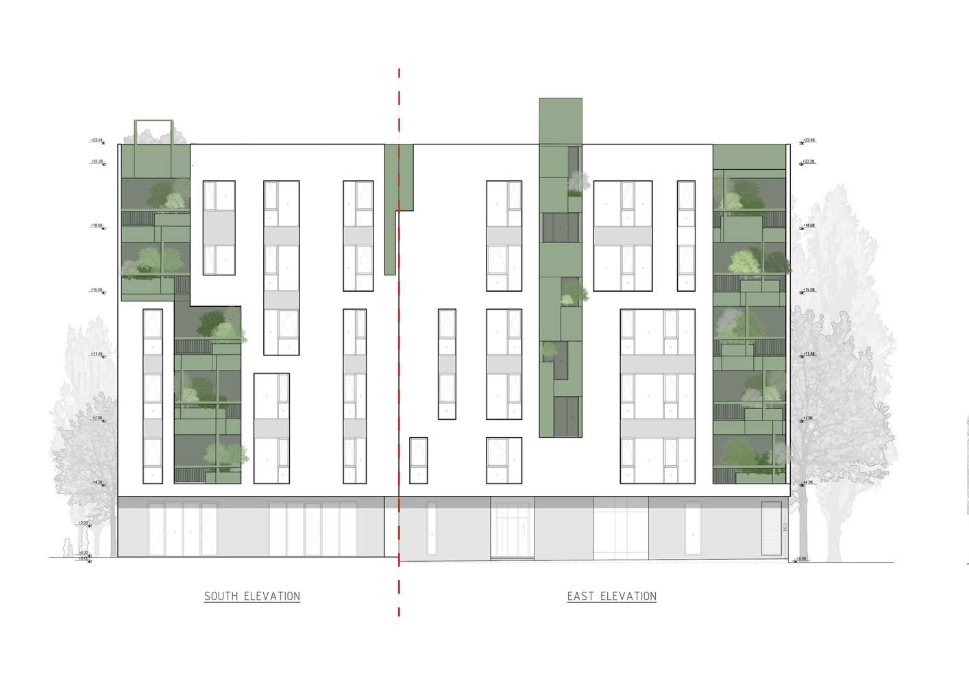 色彩与材质上刻意形成的对比,强化了设计理念上的转变。在这里,绿植并非单纯的装饰,而是公共与私人空间之间的调和者,既为居民提供庇护与宁静,又让城市拥有一面充满生机的立面。