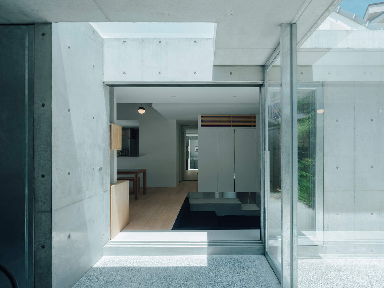 该钢筋混凝土中空层设置于 LDK 区域与私密空间翼楼之间,作为核心枢纽将整座住宅有机串联。两处无框天窗及面向庭院的大型开口引入柔和的漫射日光,光线在裸露的混凝土表面轻盈反射,与木构体系形成对比。