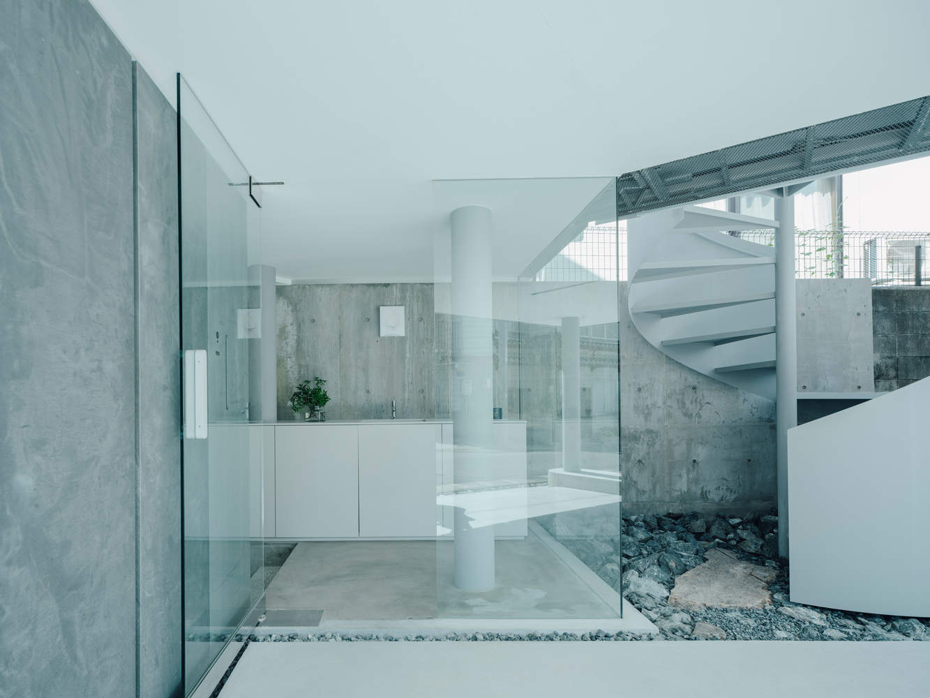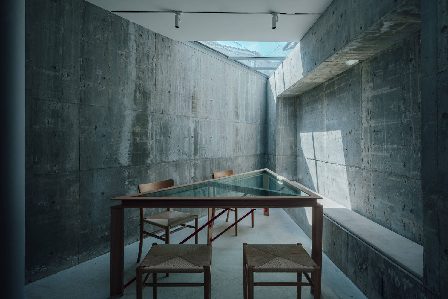 The reinforced concrete hollow layer is set between the LDK area and the private space wing, serving as the core hub to organically connect the entire residential building. Two frameless skylights and a large opening facing the courtyard introduce soft diffuse sunlight, which is lightly reflected on the exposed concrete surface and contrasts with the wooden system.