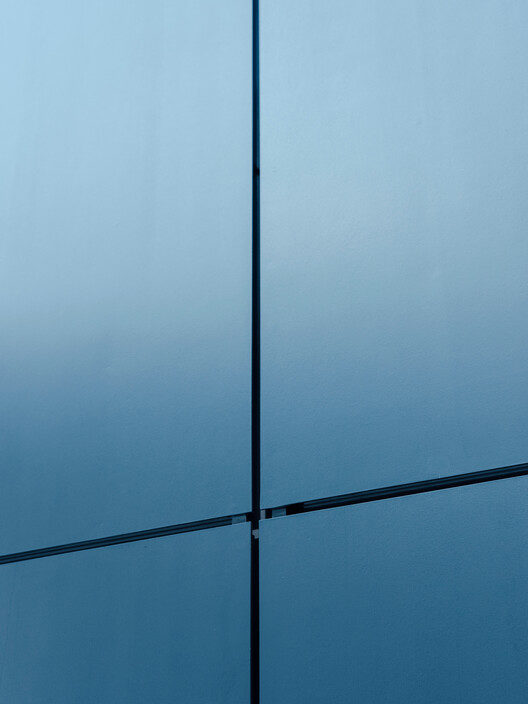 材质与光影的诗意呈现:建筑外立面是该项目的又一亮点,银色涂装的纤维水泥板和百叶窗的设计,赋予了建筑动态的生命力。通过保留接缝的裸露状态,并巧妙地将排水槽融入其中,既解决了技术问题,又凸显了材料的层次感。南侧的斜向墙体,随光线变化而呈现出不同的色调,为建筑增添了时间的流逝感。百叶窗的灵活调节,不仅改变了光线的强度,还在墙面上投下了细腻的阴影,营造出宁静的氛围。这种对材质、光影的巧妙运用,使得建筑不再是冷冰冰的物体,而是充满了诗意和情感,体现了建筑师对建筑本质的深刻理解。