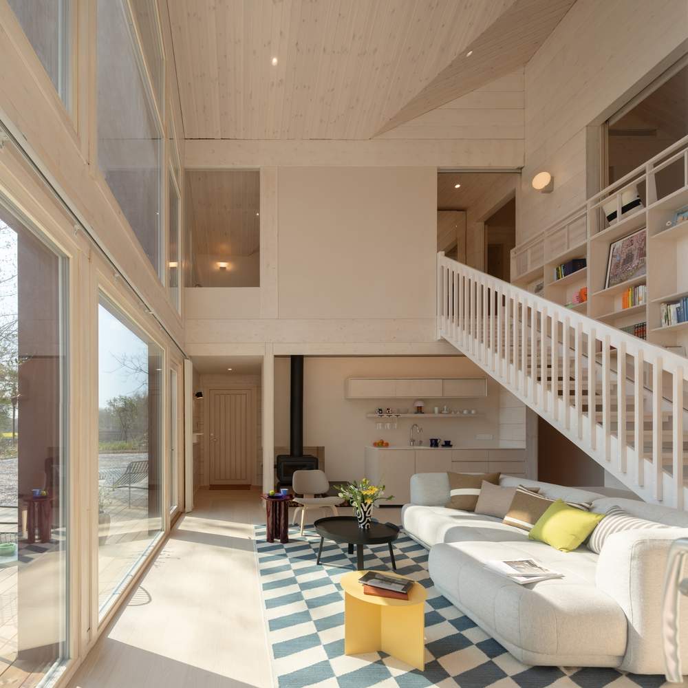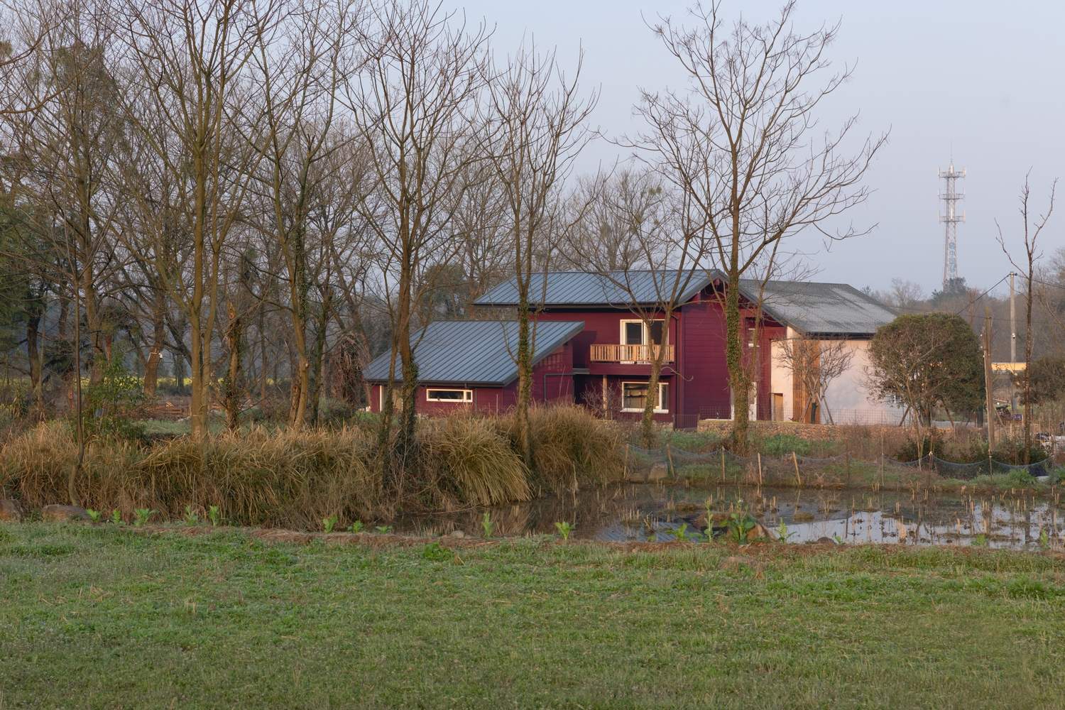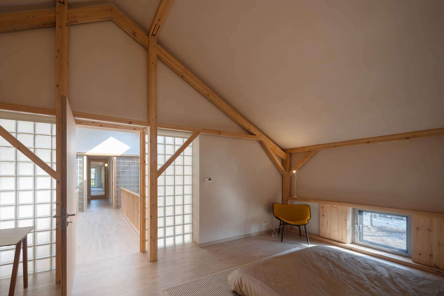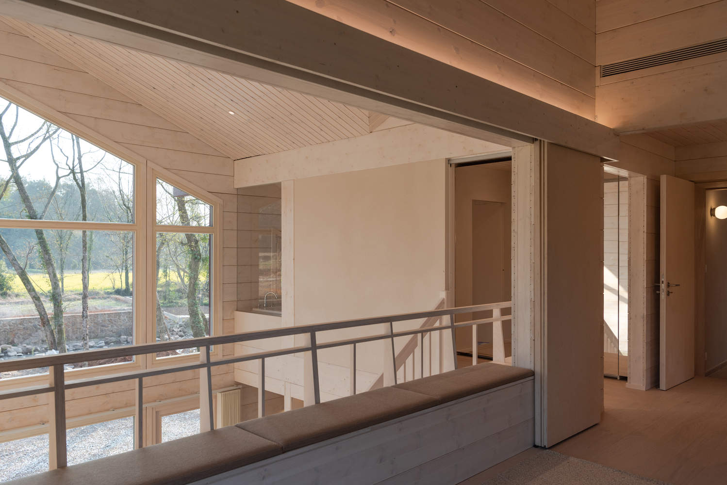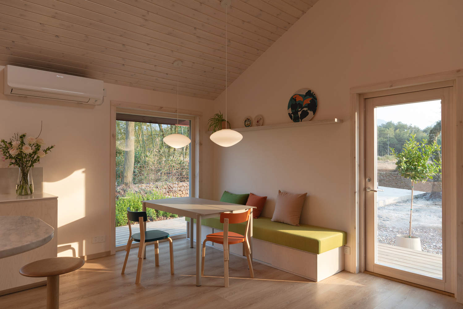堂屋,木屋,餐厨,三座建筑体量均融入了传统中国院落住宅的基因,在各自的场景以不同的语言再现。主卧室的对开移门通向光线漫溢的中庭,将视线引向田野与溪流。经过重新演绎的“美人靠”轻倚其间,框取晚日与高林。早餐时分,远山轮廓与竹林群落化作一幅活态画卷——是对苏州园林“借景”手法的当代致敬。