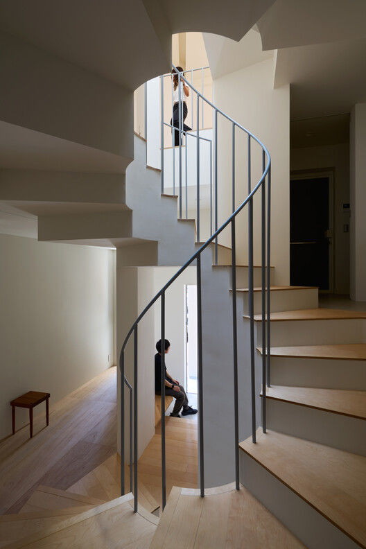 项目亮点:空间策略的创新: 该项目最引人注目的亮点在于其对空间策略的巧妙运用。在周边高楼林立、视线受限的环境中,建筑师并未拘泥于传统的平面布局,而是选择了一种极具创造性的方式来应对挑战。通过引入圆形天窗和螺旋楼梯,建筑师成功地将天空的景观引入室内,为居住者创造了独特的视觉体验。这种设计策略不仅解决了采光问题,更重要的是,它打破了传统住宅的封闭感,使居住者在城市中心也能感受到开阔的视野。此外,错层布局的房间设计也增加了空间的趣味性和互动性,使整个住宅更具活力。