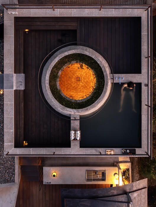 姿态完全不同的建筑物环绕围合成精心组织的前院综合体,包含日晷塔和瑜伽冥想室、书塔和客厅、主人大平层套房、餐厅、6个可供客人留宿的房间和其它配套区域;花园后院包含储藏间、酒窖、晾晒区、木工坊和营地。