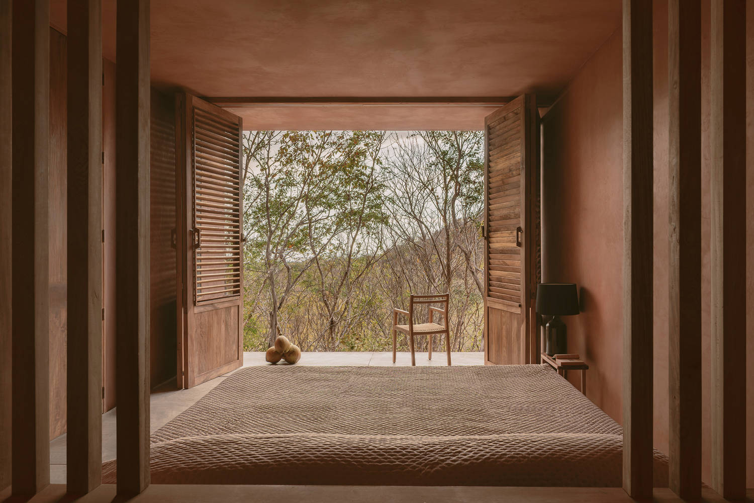 最下层为卧室区,窗外景色与树冠融为一体,营造出室内外亲密无间的氛围。设计中采用的土色调材料,让人联想到落日的温暖色彩,同时也巧妙呼应了螃蟹的外壳,进一步强化了建筑与埃斯孔迪多港干旱景观的视觉融合。而散布于房屋各处的水景,则让人联想到希埃尔韦阿瓜(Hierve el Agua)的石化瀑布。