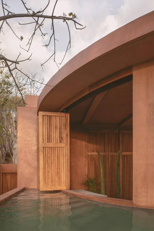 The lowest level is the bedroom area, where the scenery outside blends seamlessly with the tree canopy, creating an intimate atmosphere both inside and outside the room. The earth tone materials used in the design evoke the warm colors of the setting sun, while also cleverly echoing the shell of the crab, further enhancing the visual integration between the building and the arid landscape of Escondido Port. The water features scattered throughout the house evoke the petrified waterfall of Hierve el Agua.