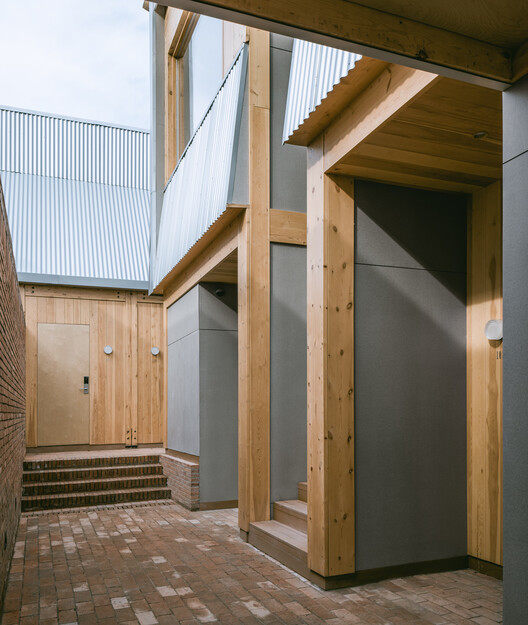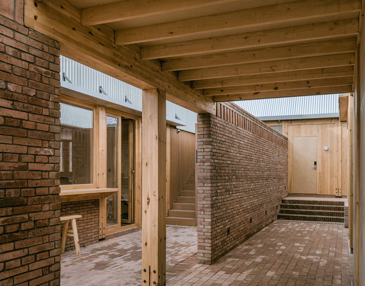 项目精髓:材料与建造的诗意表达:项目的精髓在于其对材料和建造的诗意化表达。建筑师巧妙地运用木材、旧红砖、金属波纹板等材料,创造出既当代又具有历史感的建筑。木结构的选择回应了山地建设的限制,而木框架和木剪力墙的组合,以及“包裹”的设计手法,赋予了建筑独特的质感。旧红砖的使用,更是将建筑与周围环境紧密联系,创造了一种“遗迹”的氛围,体现了对时间和历史的敬意。这种对材料的巧妙运用,赋予了建筑独特的个性和韵味。