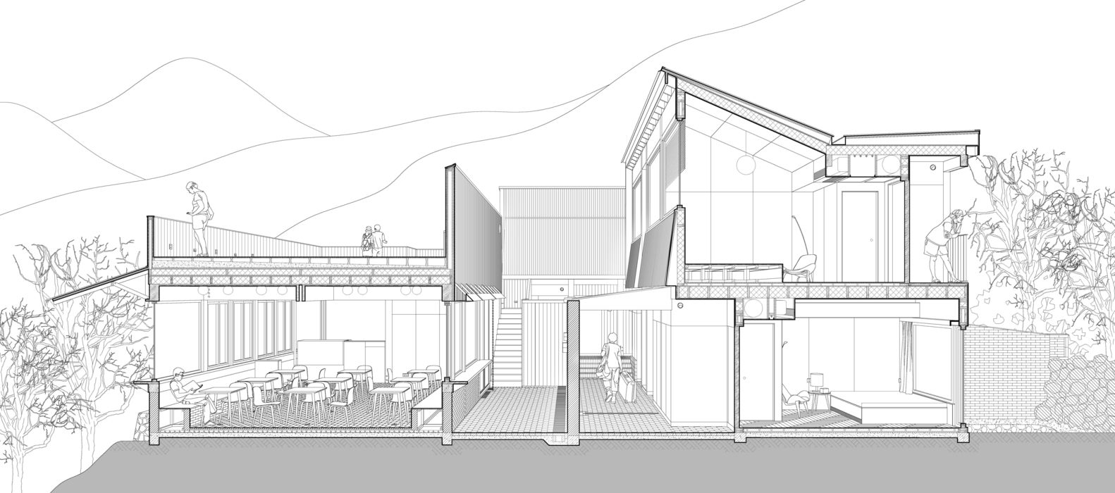木造物与新遗迹 - 由于山地的建设限制,整组建筑选择用木材建造,不大的体量中,我们组合使用了木框架和木剪力墙两种形式。木框架部分我们有意避开了传统木构的形式语言,比如,平面上采用了偶数开间,立面也呈现非对称的形制,挑檐部分则放弃了木构,以更轻便和真实的钢结构去实现。