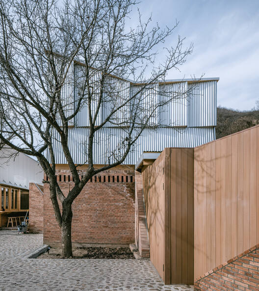 The wooden shear wall section focuses on showcasing the logic behind the action of "wrapping", allowing the building to gain a corresponding sense of weight within the wrapping. The upper roof was reshaped with metal corrugated panels to enhance the appearance of the building. Its details draw inspiration from the formal language of the original workshop, making this wrapping more in line with the material's own construction context.