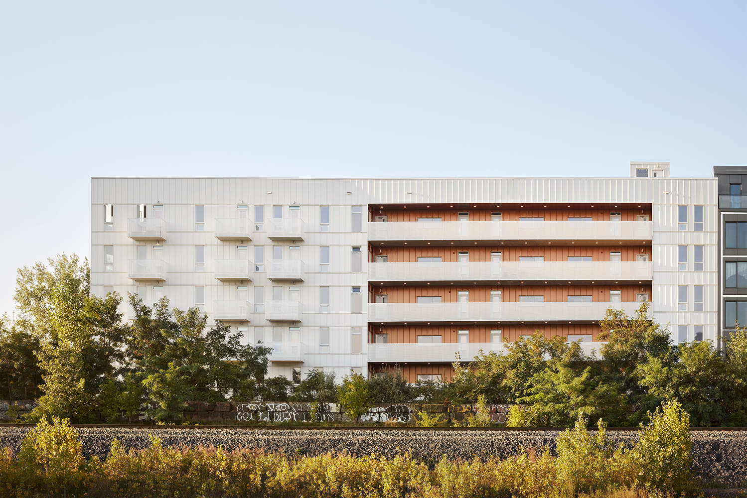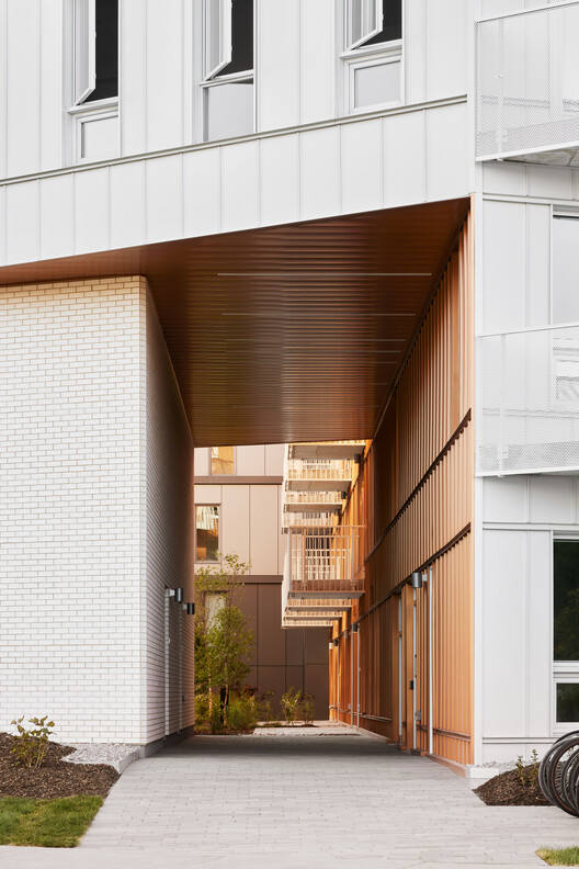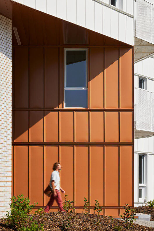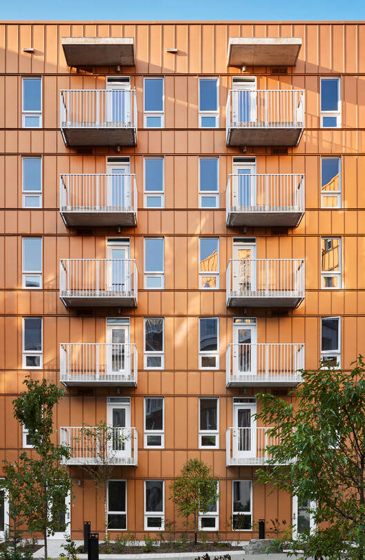 The carved metal exterior walls wrap around the balcony of the building, maximizing visibility and protecting privacy, while optimizing the orientation of the building to fully utilize solar energy. The resulting angled design evokes rhythmic industrial elements such as factory roofs and silos. The brick part seems to be an existing base from different eras, while the metal part was added later. In the core area of the project, when the building volume is excavated to form a public space, the copper surface is exposed. This symbol of collective energy in the shared apartment extends to the surrounding community through a porch.