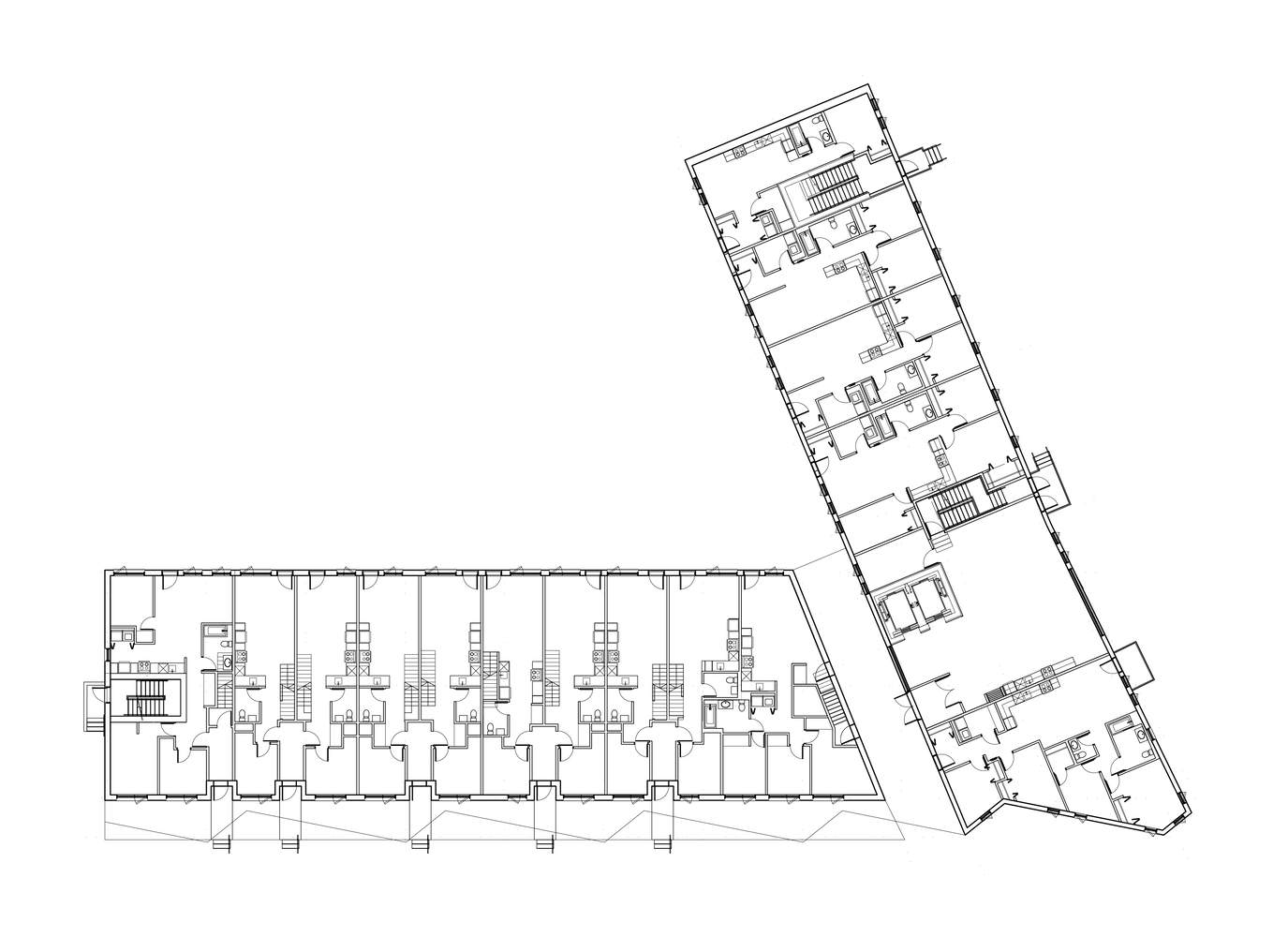 该项目将居民的愿景与契合城市肌理的建筑手法相结合,与周边建筑的多元尺度相呼应。项目由两个相互咬合的建筑体量构成:一个两层的砖砌家庭单元部分,延续了周边住宅区的人性化尺度;而一个六层的白色金属建筑部分,则呼应了邻近大学校园建筑的规模。这种组合方式借鉴了周边工业建筑通过连续扩建形成的叠加逻辑,这些工业建筑往往采用不同材料和建造技术。