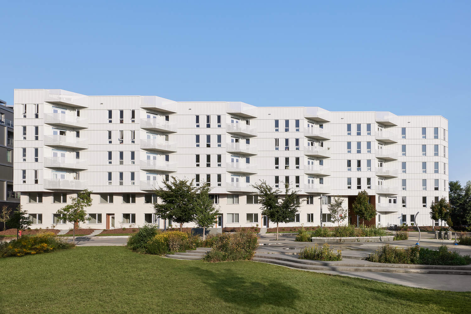 The Mil ü dler Island shared apartments are located in the heart of a community that has obtained LEED AQ certification, and their energy performance exceeds relevant standards. The project adopts a bioclimatic strategy to enhance the well-being of residents. The project achieved maximum cross ventilation and installed a Canadian style ground source heat pump system below the courtyard floor to preheat the building's air supply.