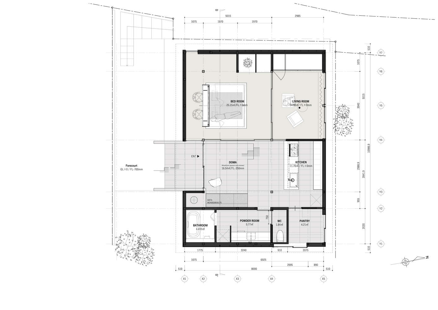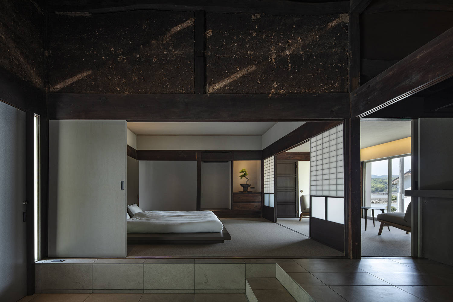 传统的“玄关土间”(曾兼具接待与厨房功能的泥土地面入口空间)被重新诠释,其空间连续性向室内延伸。这一设计创造了室内外空间的流畅过渡,打造出一个灵活的半公共场所,反映了渔村的社群特质。