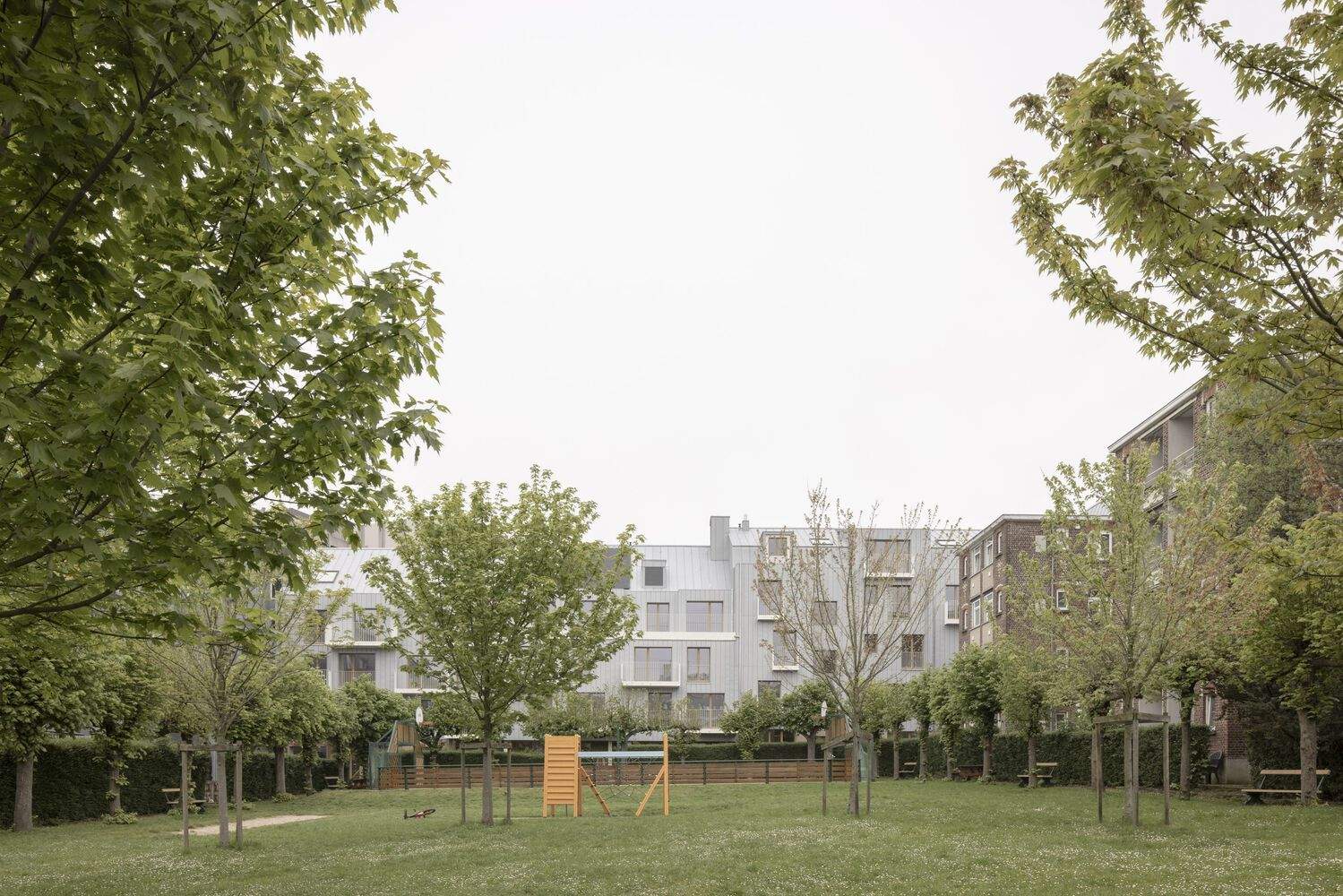 建筑后方的绿地被改造为私家花园,蜿蜒的步道将楼梯间与共享庭院串联。新开辟的通道贯通博塞尔堡街(Rue Fort de Boncelles),优化了步行与骑行通达性,促进邻里互动。共享花园、休憩区及运动场共同构成景观体系,成为居住空间的自然延伸。