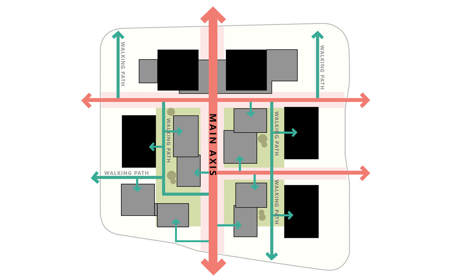 The plan adopts a one axis three cluster structure with high and low combinations. High rise buildings are arranged along the main road to form the urban image interface, while multi story buildings enclose courtyard spaces suitable for walking.