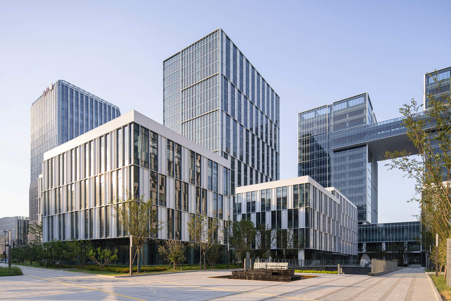 规划采取高低组合的一轴三组团架构,高层建筑沿主干道布局形成城市形象界面,多层建筑则围合出适宜步行的庭院空间。最具标志性的双子塔通过总长 80m、跨度达 23m 的空中云廊连接,形成强烈视觉记忆点。同时园区通过中央主轴和多层级开放空间——下沉庭院、街角绿地、屋顶花园、中心广场等,相互渗透延展,并积极接入城市网络。