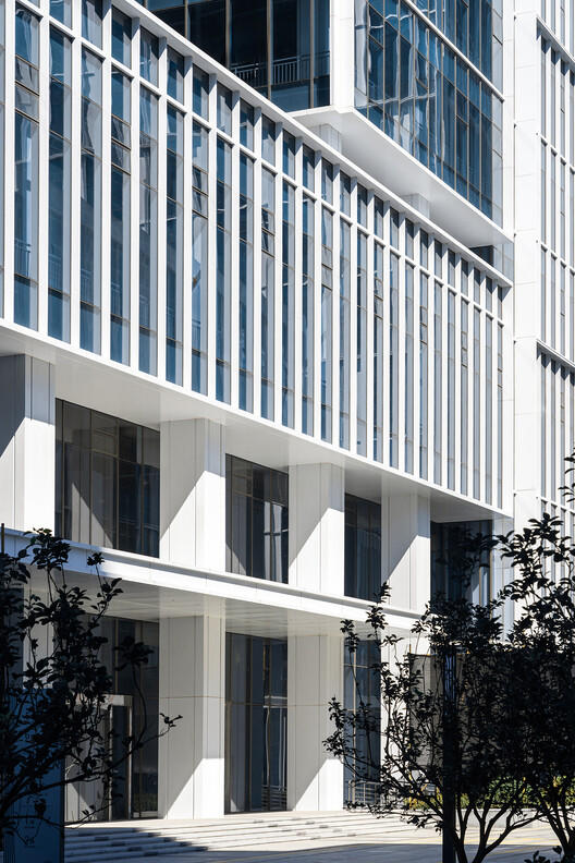 . The facade design also utilizes standard unit combinations, echoing the characteristics of the digital industry. With a grid matrix of virtual and real elements and sharp geometric lines, it shapes a clear, bright and fast technological image, reflecting a good sense of visual hierarchy and facade integrity.