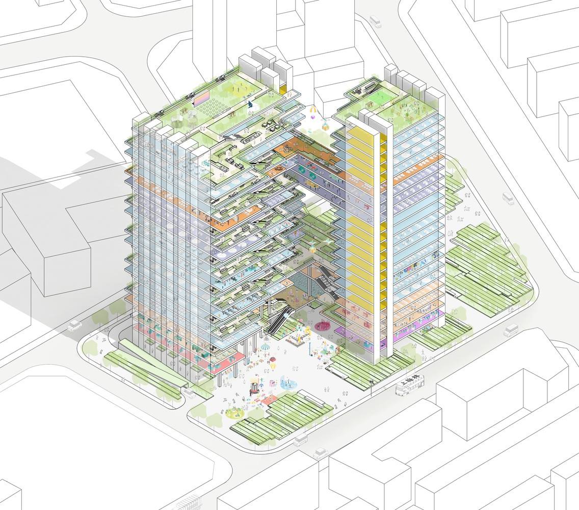 . The building abandons the traditional closed and fixed contours of high-rise offices in appearance, bringing nature and daily life back to each floor. The readily accessible eaves space will evoke emotions and create a dialogue between space and time. In our spare time, we encourage everyone to step out of the office and come to the 'community balcony' to fully communicate with people and nature: when the elites in the office building share a vertical village with the old neighbors, this kind of life is not a carefully designed theme park, not a utopian forced integration, but a community with community identity.