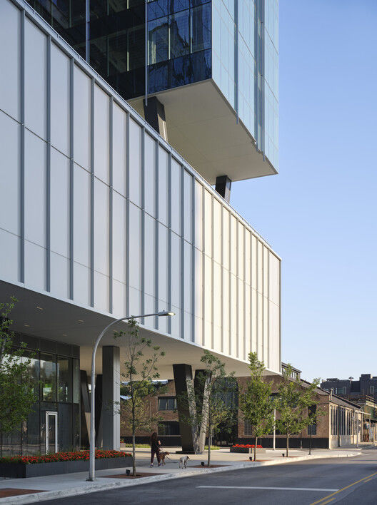 项目选址与城市肌理的巧妙结合:360 N Green Street 的选址策略是其最大的亮点之一。项目位于芝加哥新兴的富尔顿市场社区,这一区域正在从传统的工业区转型为充满活力的商业中心。建筑师精准地捕捉到了这一城市发展趋势,将项目定位为服务于专业服务公司的甲级办公大楼,填补了该区域的市场空白。此外,项目与西卢普区既有的建筑风格和城市肌理相协调,同时又保持了自身独特的现代设计语言,这体现了建筑师对城市文脉的深刻理解和尊重。这种策略不仅提升了项目的商业价值,也为城市更新注入了新的活力。