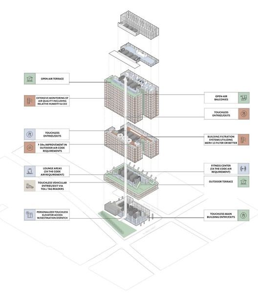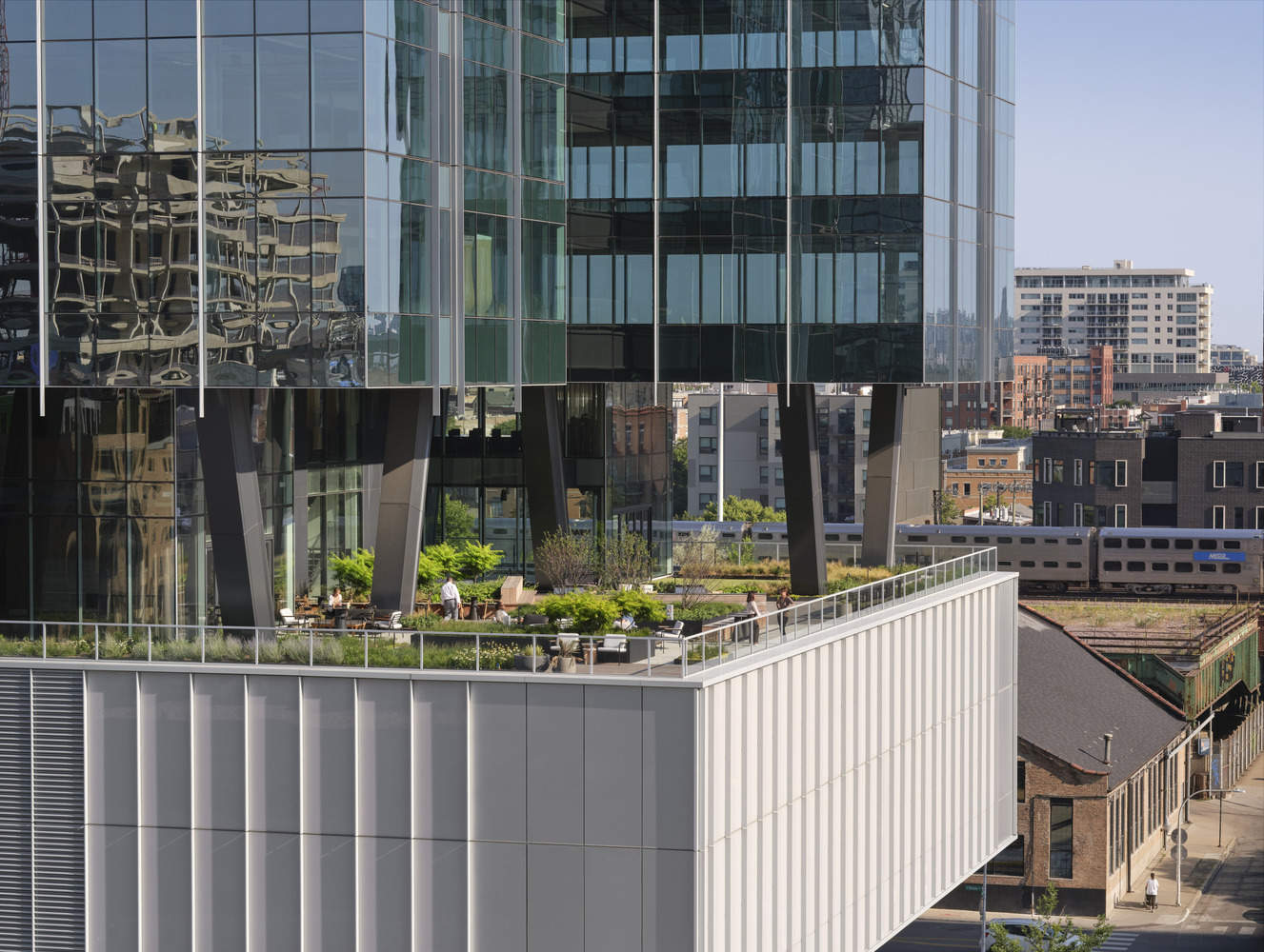 可持续设计与对未来工作模式的探索:360 N Green Street 的另一大亮点是其对可持续性和未来工作模式的积极探索。项目采用了高效的机械系统和高性能的建筑围护结构,同时积极申请 LEED 银级认证,体现了对环境友好的承诺。更重要的是,建筑师关注后疫情时代人们的办公需求,通过引入露台、开放空间等设计,促进了员工的健康和福祉。项目试图探索建筑形式与用户身体、社交和心理健康之间的共生关系,鼓励创新工作方式,这反映了建筑师对未来办公趋势的深刻思考,也为其他建筑项目提供了有益的借鉴。