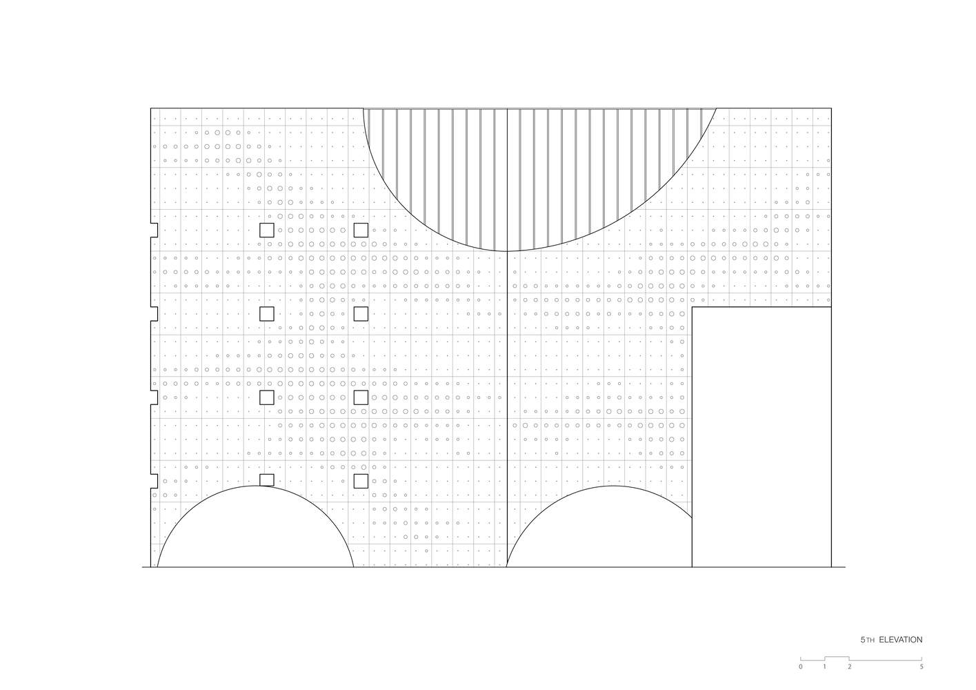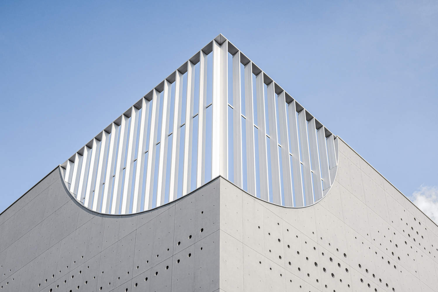 在混凝土外壳与玻璃体块之间,有一个通透的过渡空间,空气和光线在此自由流通。这个垂直中庭将视线引向上方,将天空框定为与自然紧密相连的直观纽带。围护墙的内面可视为建筑的“第五立面” —— 一幅从地面延伸至屋顶的垂直画卷 —— 通过它,人们可以感知到光的无尽存在。圆形穿孔大小不一,与清水混凝土的结构螺栓网格相对应,为原本庞大的体块注入了人性化尺度。阳光透过这些小孔洒入,柔和地扩散成斑驳的光束,映入室内。