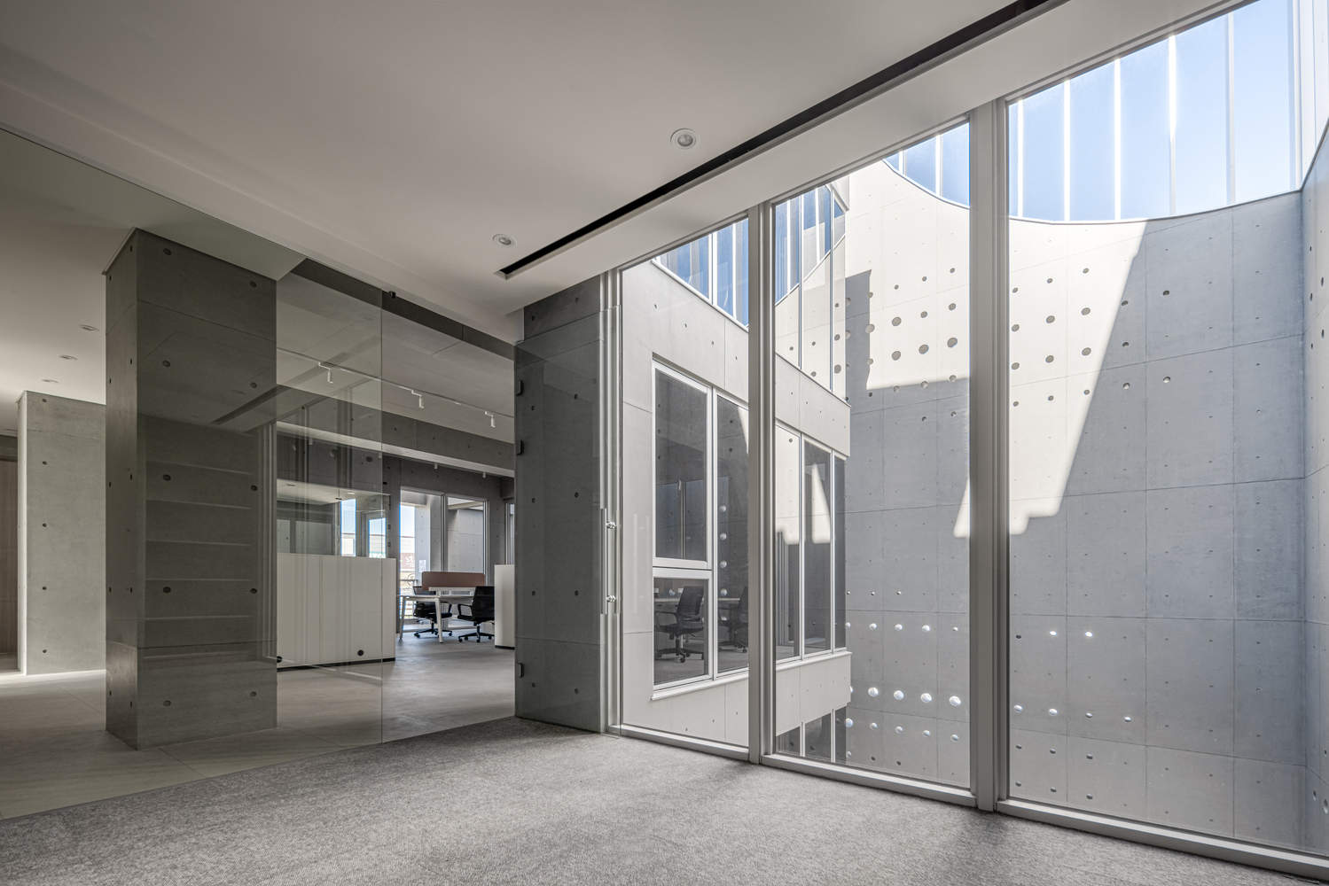 材料与结构的对话: 项目在材料选择和结构设计上展现出极高的专业水准。混凝土外墙的坚固与内部玻璃体块的轻盈形成鲜明对比,展现了材料的张力。圆形穿孔的设计,既是对结构螺栓网格的呼应,又为人性化尺度提供了注脚。阳光透过这些穿孔,在室内形成斑驳的光影,丰富了空间层次。简洁的建筑形式,精准地平衡了体量与空间,将建筑的本质提炼至结构与材料的纯粹。这种对材料的精湛运用,不仅增强了建筑的视觉效果,也提升了其整体的品质感,使建筑更具持久的魅力。