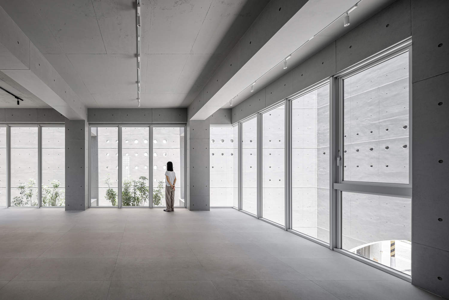 There is a transparent transition space between the concrete shell and the glass block, where air and light can freely circulate. This vertical atrium directs the line of sight upwards, framing the sky as an intuitive link closely connected to nature. The interior of the enclosure wall can be regarded as the "fifth facade" of the building - a vertical painting that extends from the ground to the roof - through which people can perceive the endless existence of light. The circular perforations vary in size and correspond to the structural bolt grid of plain concrete, injecting a humanized scale into the originally large block. Sunlight shines through these small holes and gently spreads into mottled beams, reflecting into the room.