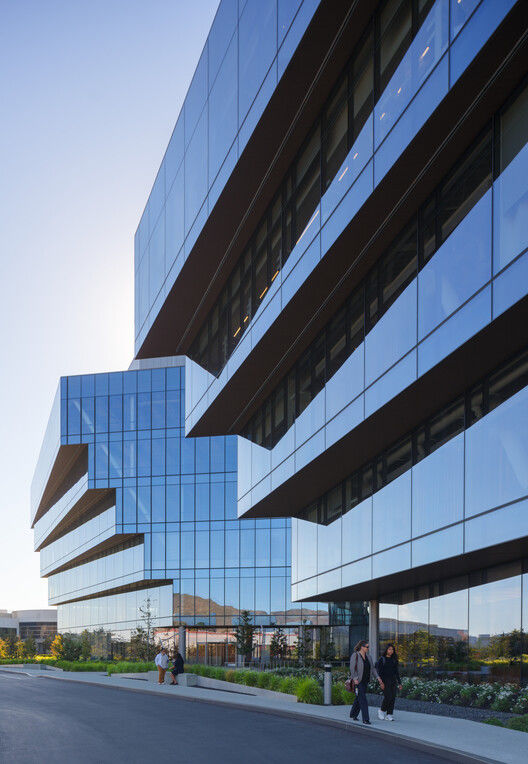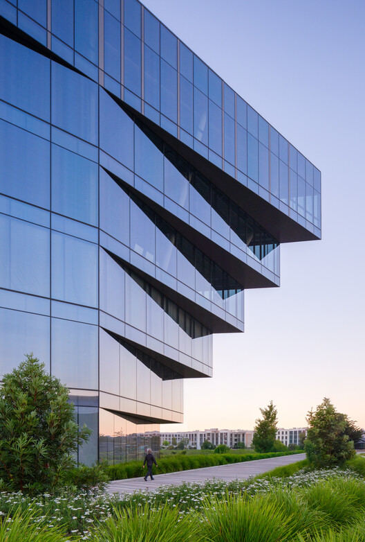 建筑外立面的玻璃色彩与反射率设计灵感源自晶体结构概念,当观者绕行于两栋建筑之间时,会看到建筑外墙仿佛在实与透之间变幻流转。玻璃幕墙所配置的条状装饰鳍片、玻璃釉点图案以及实心窗间墙,共同构成一套高效系统:冬季可最大限度吸纳太阳热能,夏季则有效减少热量吸收,同时全年优化自然采光在楼层平面上的分布,从而降低暖通空调系统及人工照明的能耗负荷。