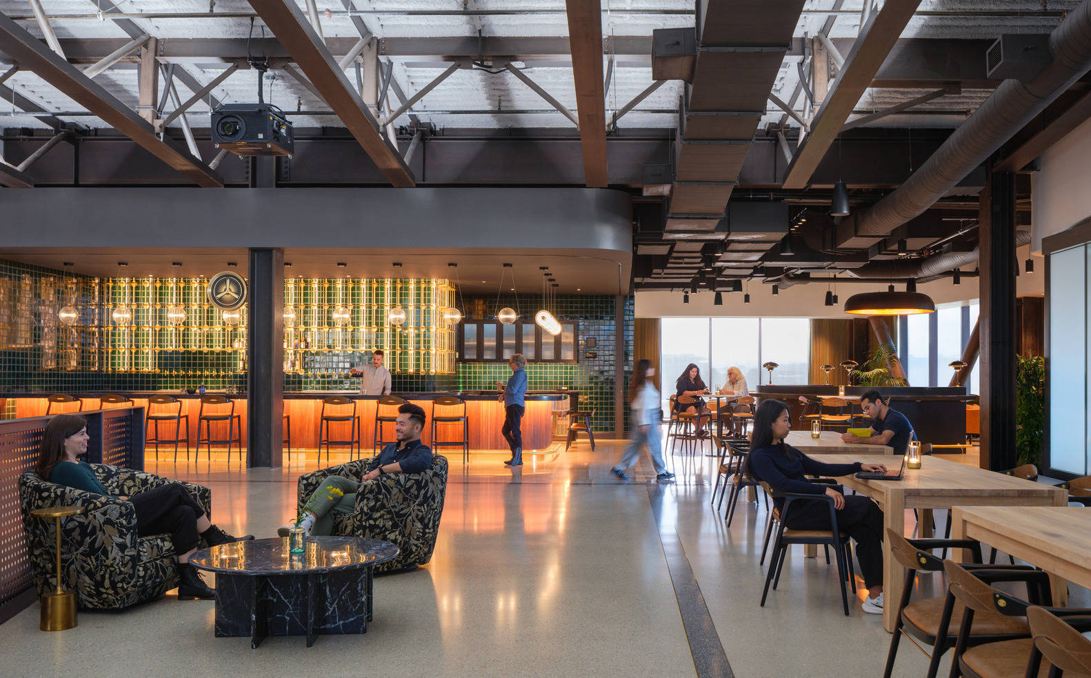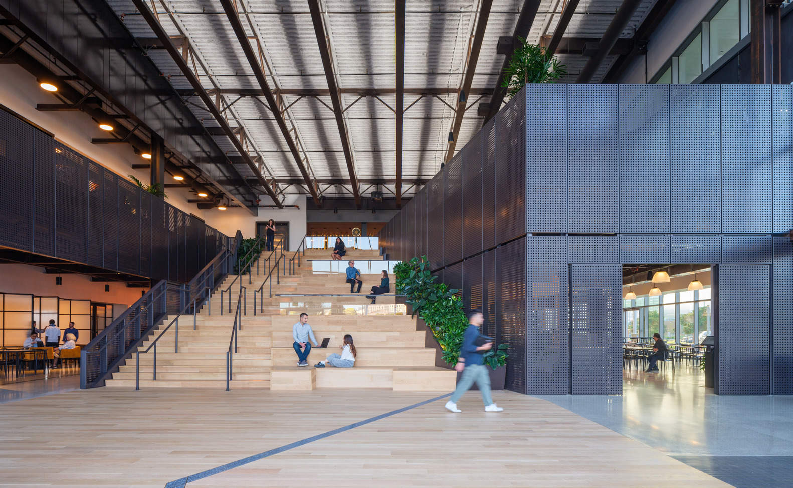 园区的社交中心是占地 42000 平方英尺的配套设施大楼——“机库”(The Hangar),它已然成为社区内最受欢迎的聚会场所之一。这里设有屋顶全服务酒吧、汇聚本地厨师的特色美食广场、会议空间、健身中心等设施。这栋两层建筑围绕中央巨型楼梯布局,在双层挑高的开放式大堂内设有非正式的休闲座椅区。其现代设计灵感源自飞机机库,这座高端配套设施大楼既致敬了该地区悠久的工业历史,也彰显了其作为生物技术发源地的地位。建筑外墙设计灵活,便于与户外空间相连通;外立面采用金属面板包覆,配以大型玻璃开口,延续了园区内其他建筑的建筑风格特色。