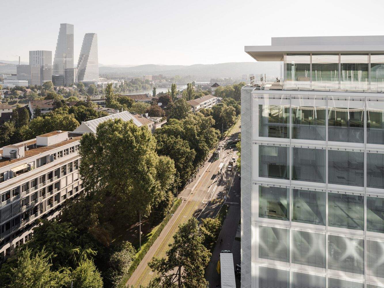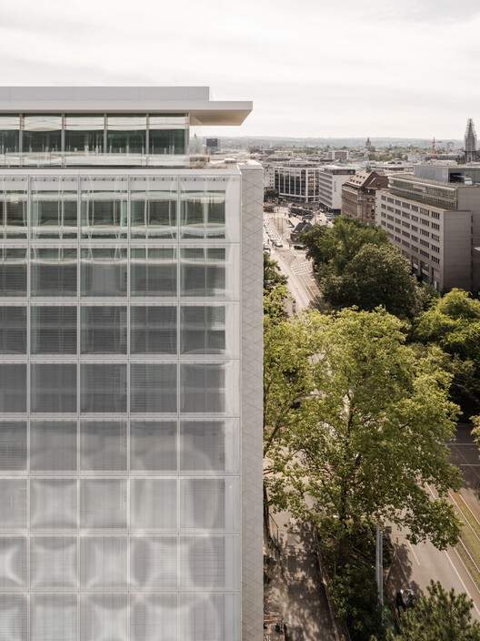 双塔。现有的办公塔楼是该场地上的首栋建筑,最初由巴特里亚保险公司(Patria Insurance Company)于 20 世纪 50 年代建造。这座塔楼并非孤立存在,而是与比例相近的《国家报》(National-Zeitung)高层建筑相邻(后《国家报》高层建筑被一座原本为瑞士银行公司 Swiss Bank Corporation 建造的低层办公楼所取代)。塔楼内部,不同类型的工作空间和聚会空间相得益彰,鼓励开展协作办公,并满足灵活性的需求。两座塔楼顶层宽大的外挑屋檐和后退式立面,令人联想起那个时代的建筑语言风格。