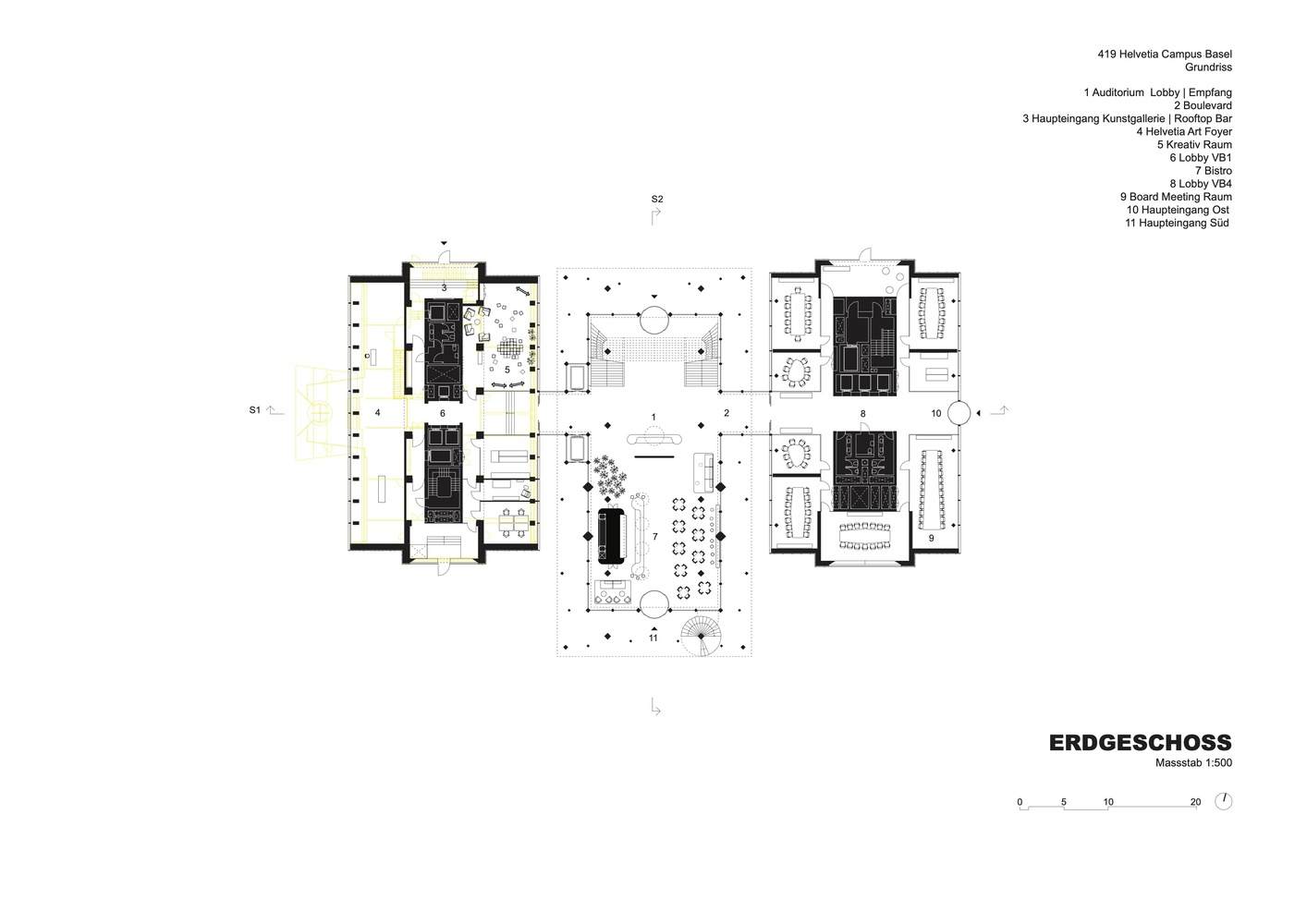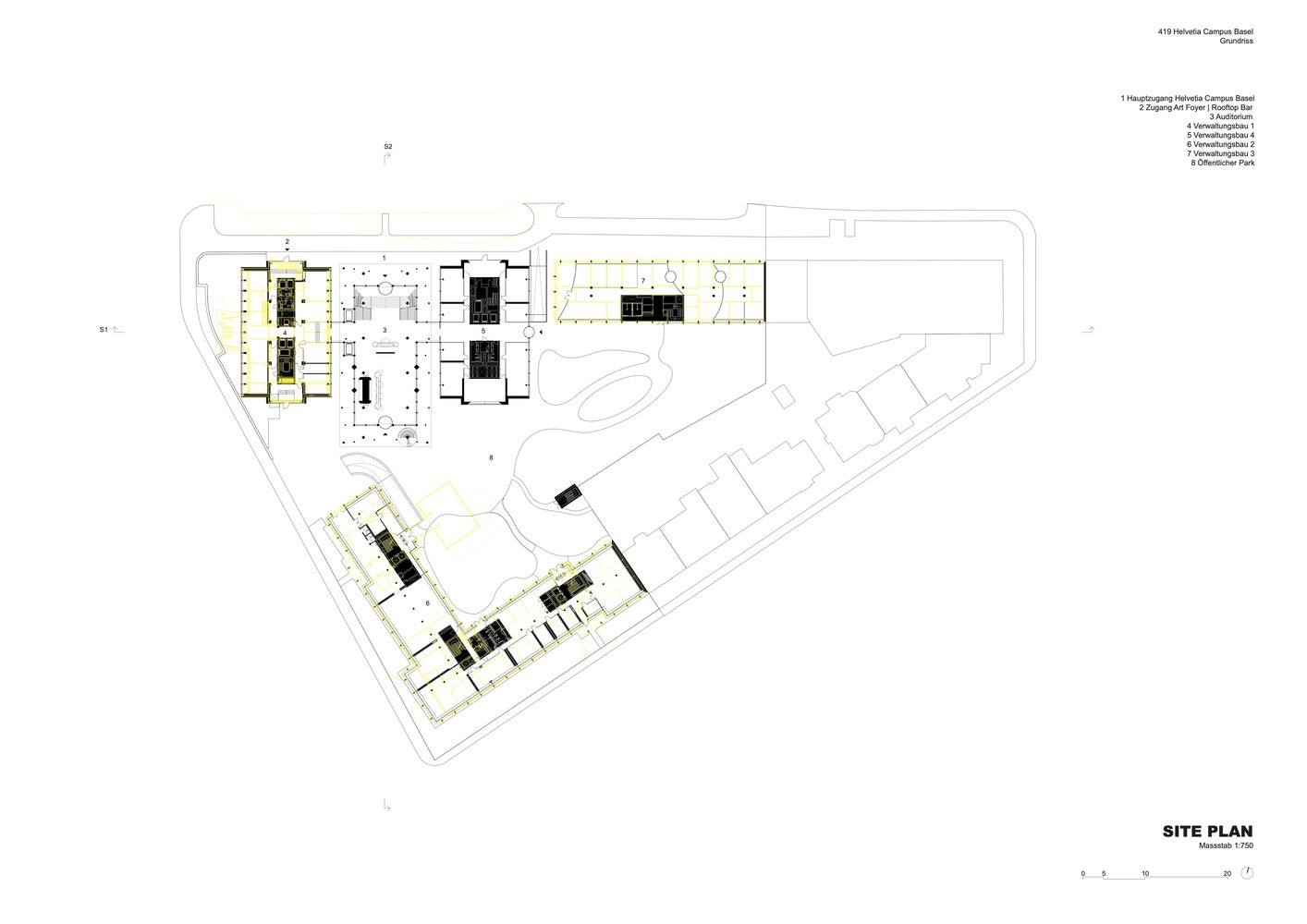 总体规划方案。自20世纪50年代以来,瑞士 Helvetia 集团巴塞尔总部的各栋建筑发展态势各异,中心区域建筑密度不断增加,周边区域的边界也愈发模糊;所有现有建筑结构均亟待翻新。为腾出空间打造一座由沃格特景观设计公司(Vogt Landscape Architects)设计的宽敞公共公园,内部庭院中一些后期增建的建筑,如会议及餐厅,被予以拆除。不同功能的重新布局,使得办公功能集中于南侧街区,居住功能则迁移至北侧,正好与圣阿尔班林荫路(St. Alban-Anlage)上的园区隔路相对。