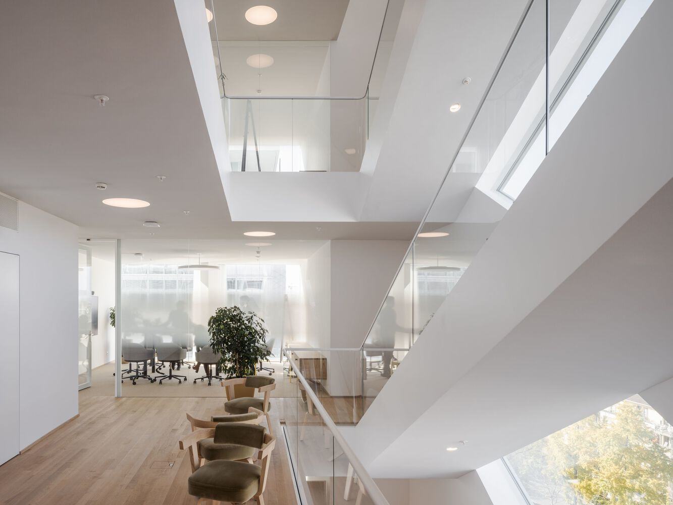 auditorium. The auditorium is an open and connected building - like an indoor square with a large curved roof. The outdoor space is paved with natural stone, and this paving style continues into the interior. People can directly enter the park through the reception area and also access other buildings within the park. A tree lined avenue connecting two towers runs through the auditorium. Employees and visitors can access the public auditorium, which can accommodate up to 300 people, through a spacious central staircase leading to the green space of St. Alban Anlage. A spiral staircase added to the outdoor area provides a direct passage between the park and the auditorium.