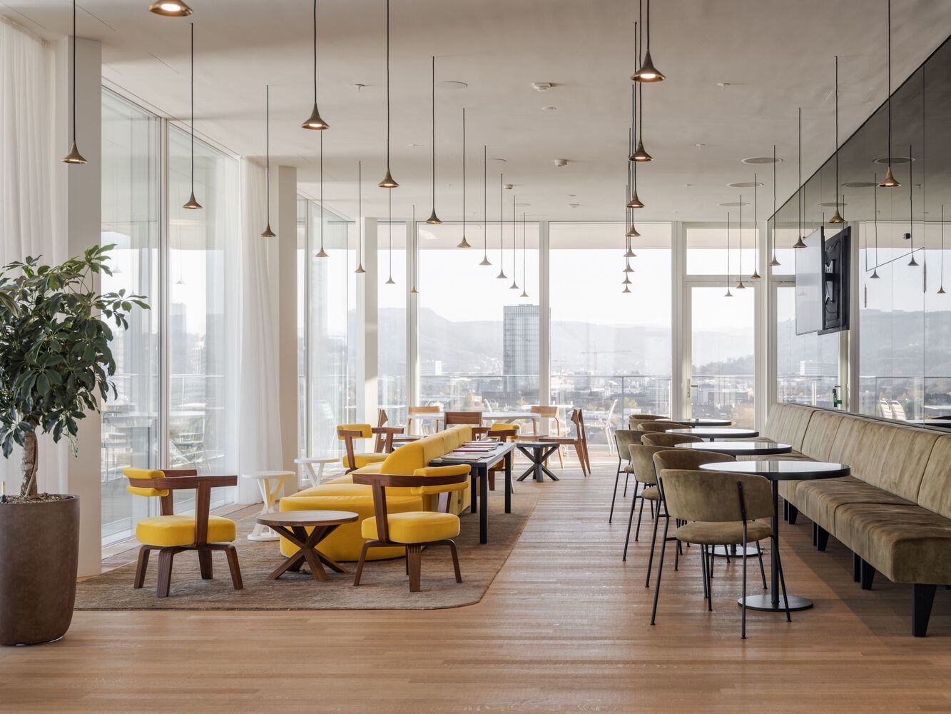 艺术。改造后的塔楼底层设有 Helvetia 艺术展厅,这一面向公众开放的艺术展览空间宛如面向城市的“橱窗”。它为艺术家及来自馆藏和新近购藏的艺术作品提供了一个极具曝光度的公共展示平台。主礼堂入口处安装有一块大型视频墙,用于展示 Helvetia 丰富馆藏中的视频艺术作品。此外,全部 21 层办公楼层均设有轮换展示的艺术品。艺术家詹姆斯·特瑞尔(James Turrell)受邀创作的两件定制作品均为场地专属装置:《钻石玻璃》(Diamond Glass,2023年)是位于现有塔楼入口大堂的一处灯光装置,迎接前来Helvetia艺术展厅和屋顶咖啡馆的访客,且直接呼应了建筑立面设计;夜幕降临后,规模更大的灯光装置《夜之盛装》(Night Raiment,2024年)则点亮两座塔楼的外挑屋檐,在园区与城市之间营造出对话氛围。
