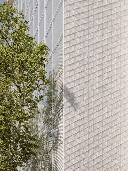 玻璃的透光率与反射率计算,以及为加强鸟类保护而采取的额外措施,均是与巴塞尔公园与园林管理部门下属的鸟类问题专业中心(Fachstelle für Vogelfragen)共同协商确定的。塔楼南北立面通过大型垂直堆叠的菱形窗户展现出独特风貌。这些窗户的造型灵感源自两座塔楼北端后方呈对角线延伸的楼梯。立面本身覆盖着 24,000 块三角形铸造玻璃砖。根据天气状况和一天中的不同时段,这些弧形玻璃砖为立面赋予了层次感与灵动之美。玻璃砖以八个三角形组成的菱形为单位,通过计算机随机生成排列方式,使整个立面呈现出丰富有趣的组合效果。