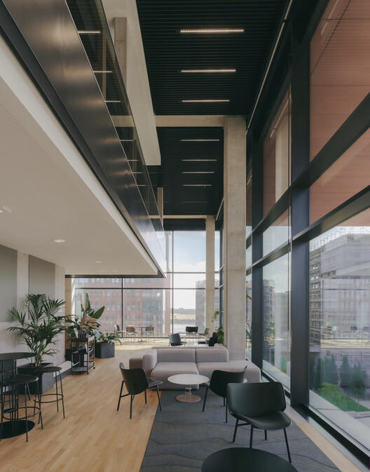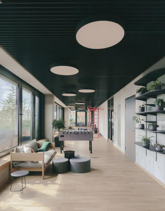 充足的自然光透过中庭和大窗户倾泻入室内。自然光与绿植、天然材质以及联网的数字技术相辅相成,共同营造出适宜工作与社交互动的舒适氛围。
