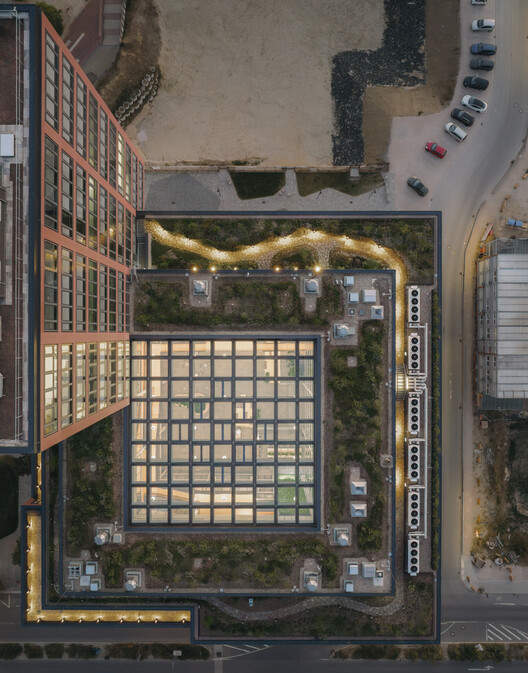 The design of this building resembles a small town, with meeting and communication areas, shared lunch and coffee break spaces, and personal relaxation areas. The ground floor is equipped with restaurants and conference facilities, while the upper floor is distributed with rentable office space, as well as collaborative and dedicated workspaces. These office spaces are designed as public areas accessible to all tenants, while a lush rooftop terrace surrounds the building, providing a space for leisure and entertainment.