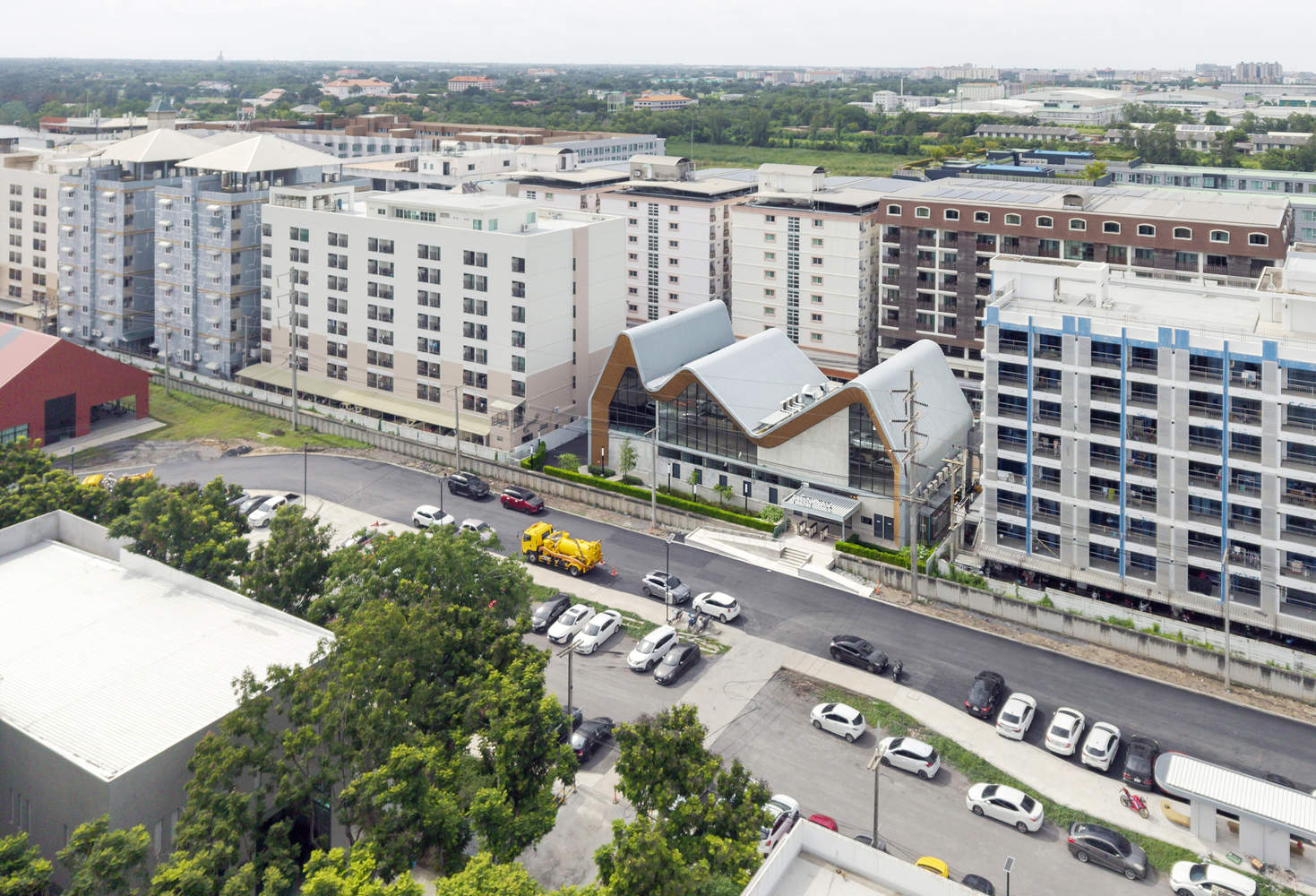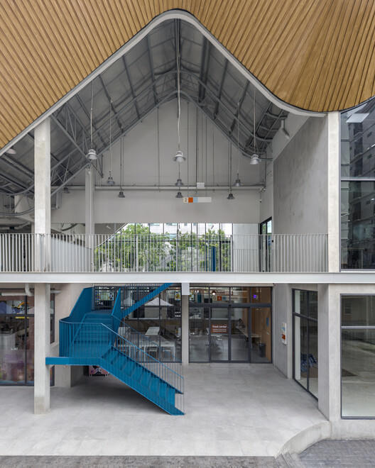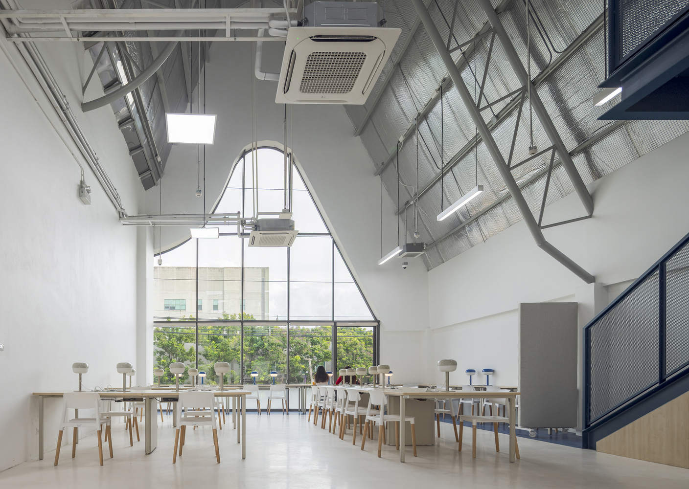 From the architect. Heyday Community Center is a brand new community activity hub at Bangkok University in Thailand. It integrates shared office space, food court, and future planned restaurants into one building, becoming the latest popular destination for student groups. The building is adjacent to the campus of Bangkok University and is located between square apartment buildings on both sides of a 1-kilometer-long street.