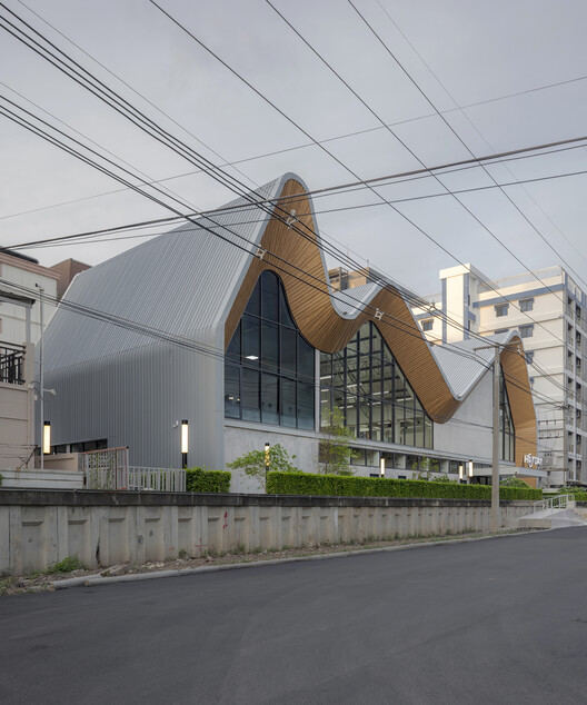 该建筑由三个带有弧形山墙屋顶的不对称体块构成,旨在打破周边方块式公寓楼的单调感。这种充满活力且独具特色的造型,意在吸引学生和教职员工,鼓励他们使用这个全新的社区中心。