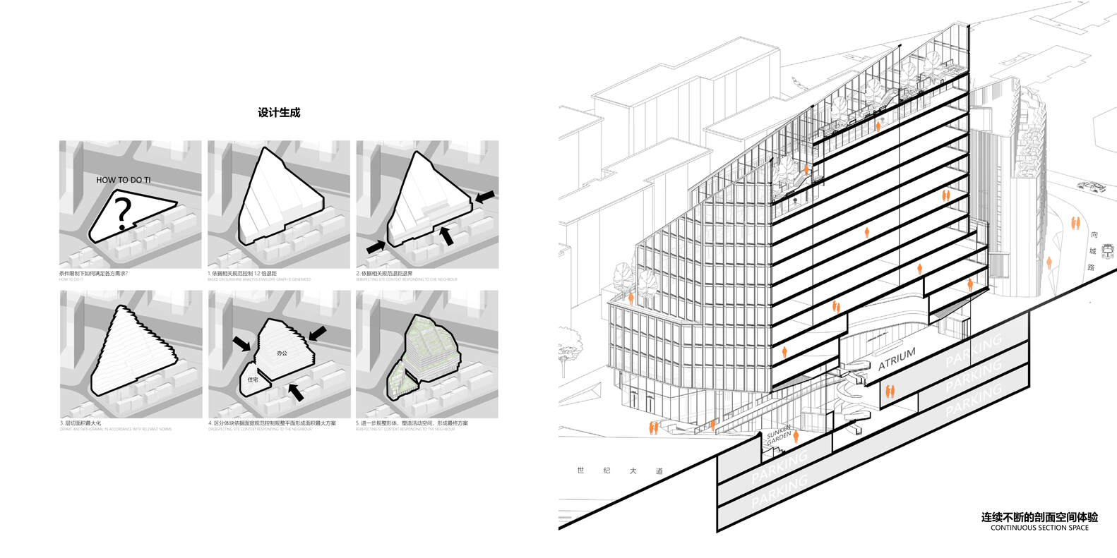 项目主体由一幢 14 层办公商业塔楼和一幢8层住宅楼组成。对于处理与城市之间的空间关系,设计团队提出了五个核心设计概念。在建筑内部营造有内容的活动场所,办公塔楼设置跨层共享中庭,日均可承载会议、沙龙、展览等多元活动场景,形成垂直维度的活力发生器。作为项目主体之一的办公商业塔楼,项目实现了私密与公共不同性质与复合功能之间的空间融合。于城市而言,项目追求表达垂直方向的故事性。以地面下沉庭院为起点,逐级经过办公大堂、共享中庭,上至办公空间,最终抵达多层级的屋顶花园,构建了贯穿 60 米塔楼的连续性空间体验。每层级空间通过光影变化与视觉渗透,形成从城市地面到云端自然的渐进式叙事。严苛的日照条件限制催生出自由流动的屋顶轮廓,跌落式绿化退台使屋顶成为可生长的“山林空间”,沿世纪大道一侧的城市界面呈现出更丰富的城市天际线。建筑沿世纪大道界面布置内凹式下沉广场,塑造与城市互动的空间关系,借助多层次灰空间实现建筑与城市的相互渗透。