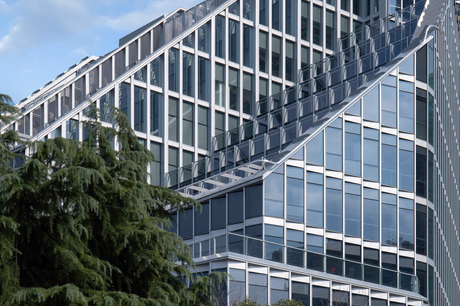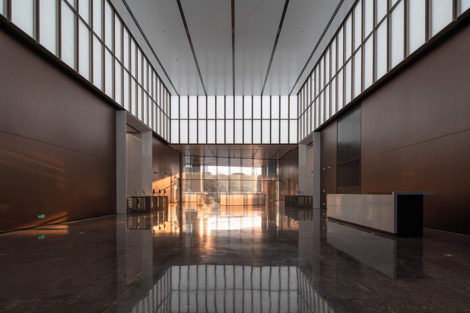 为解决建筑外立面开窗及泛光照明导致的外观缺陷问题,设计团队通过视觉样板(VMU)进行了多轮细致的对比研究和优化,创新性地研发了新型透明呼吸式折面玻璃幕墙。折面玻璃幕墙的侧面穿孔弧面铝板外包设计,有效引导夏季风进入室内,又赋予了建筑立面更加灵动的视觉效果。此外,外立面还特别设置了外部遮阳元素以减少阳光直射。革新性的幕墙设计充分考虑了立面的外观美学、整体性与实用性,通过设计的精益求精实现了形式与功能的和谐统一。