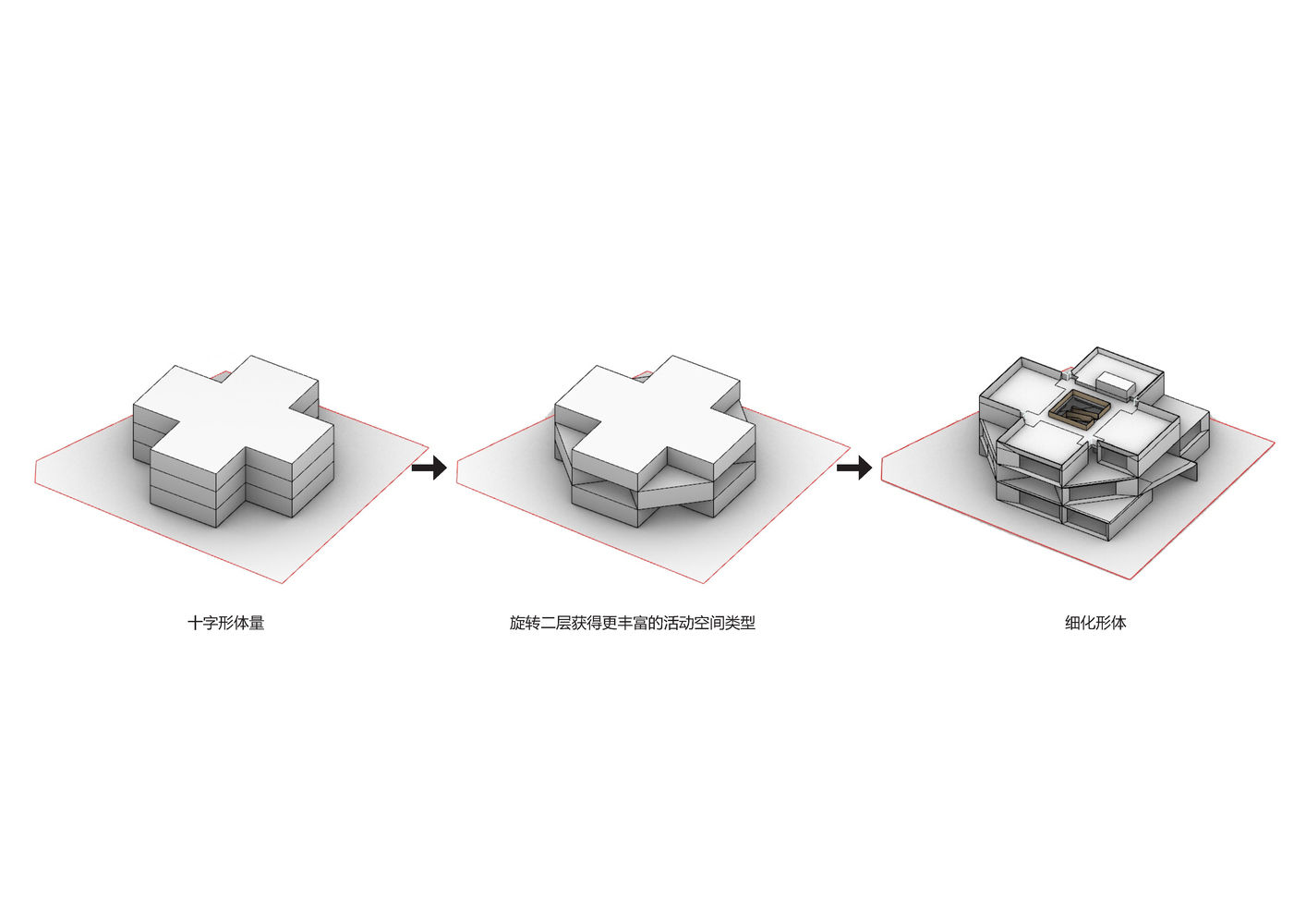 于是,我们也采用十字作为空间的基本骨架加工成一个标准层,并且每层都像拧魔方一样将其旋转 45° 后摞在一起。由于这个旋转,本来每层之间简单复制的关系变得丰富多样,在外部产生了虚实相间的视觉效果,以及一些 “边边角角”的空间。从而衍生出首层的架空层,二层的阳台,三层的露台,及屋顶等不同的空间类型。而内部的结构虽然单独看每层都一样,但由于各层之间方位的旋转,产生了既相似又不同的感觉。不同层的教室窗外的风景不一样,而穿越中庭的楼梯,也不断改变着方位,与走廊形成不同的对话关系,进一步丰富了建筑内部的体验,甚至给孩子们带来一些空间方位感上的小小的挑战。